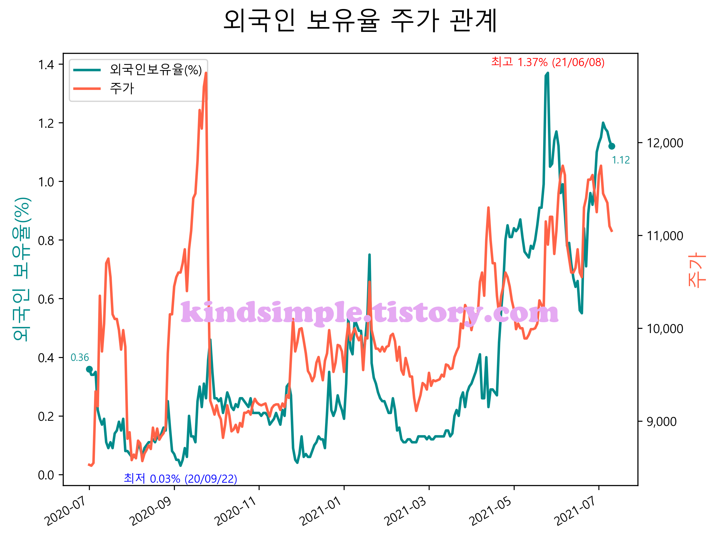 최근 1년간 외국인 보유율 및 주가와의 관계입니다.