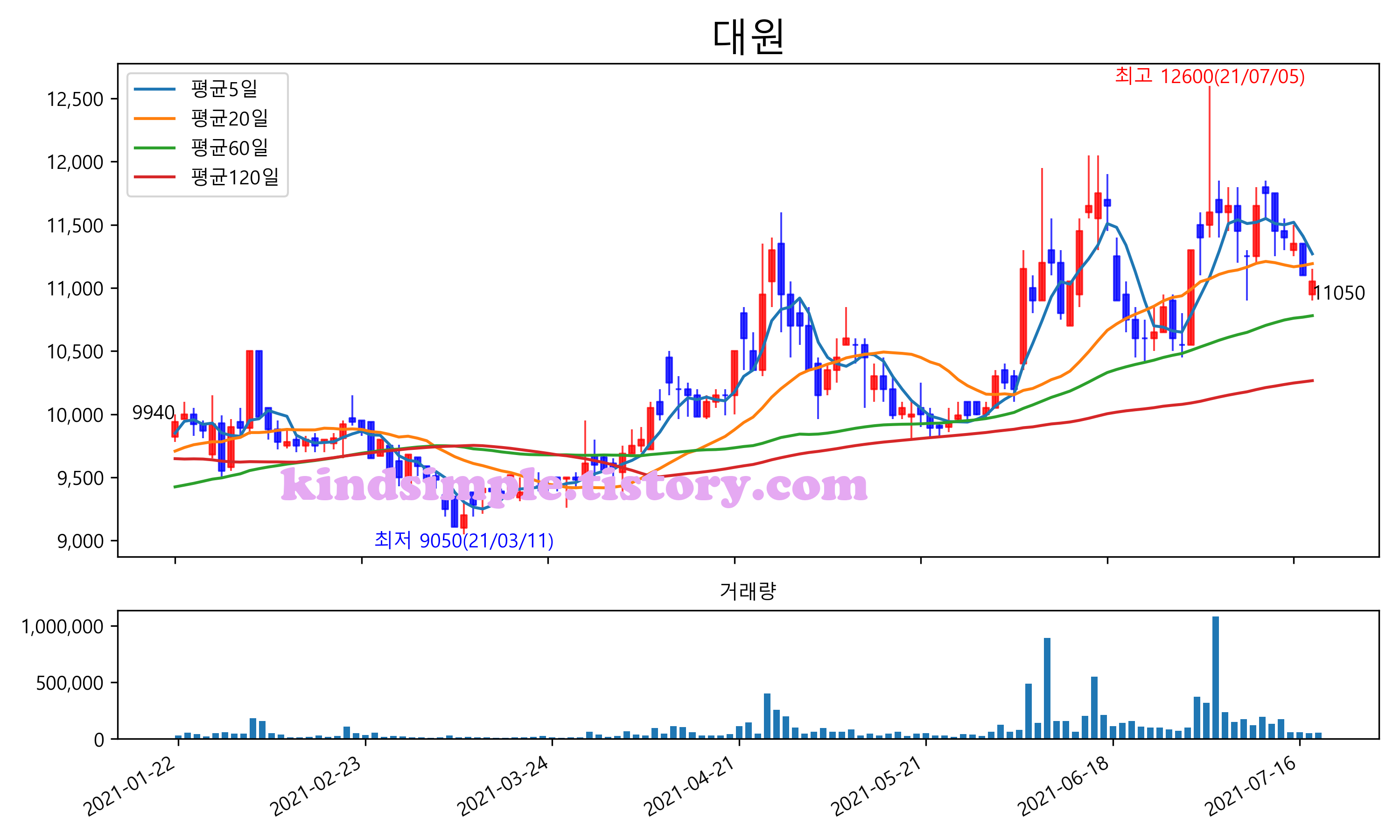 최근 6개월간 캔들차트 및 이동평균선입니다.