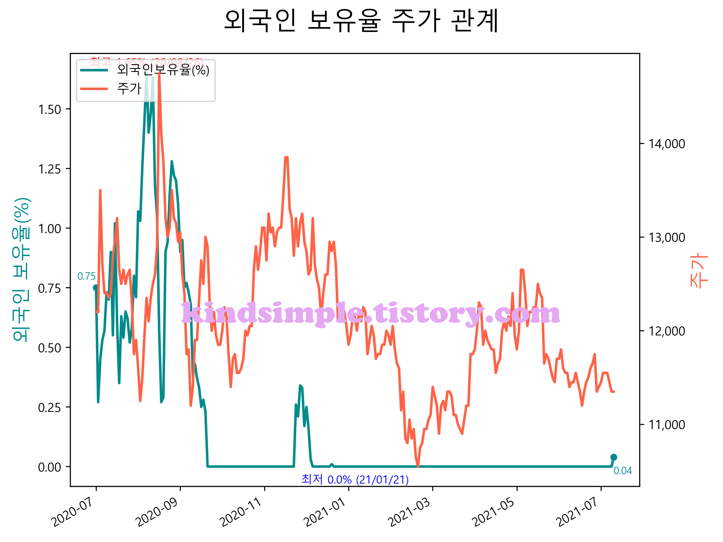 최근 1년간 외국인 보유율 및 주가와의 관계입니다.