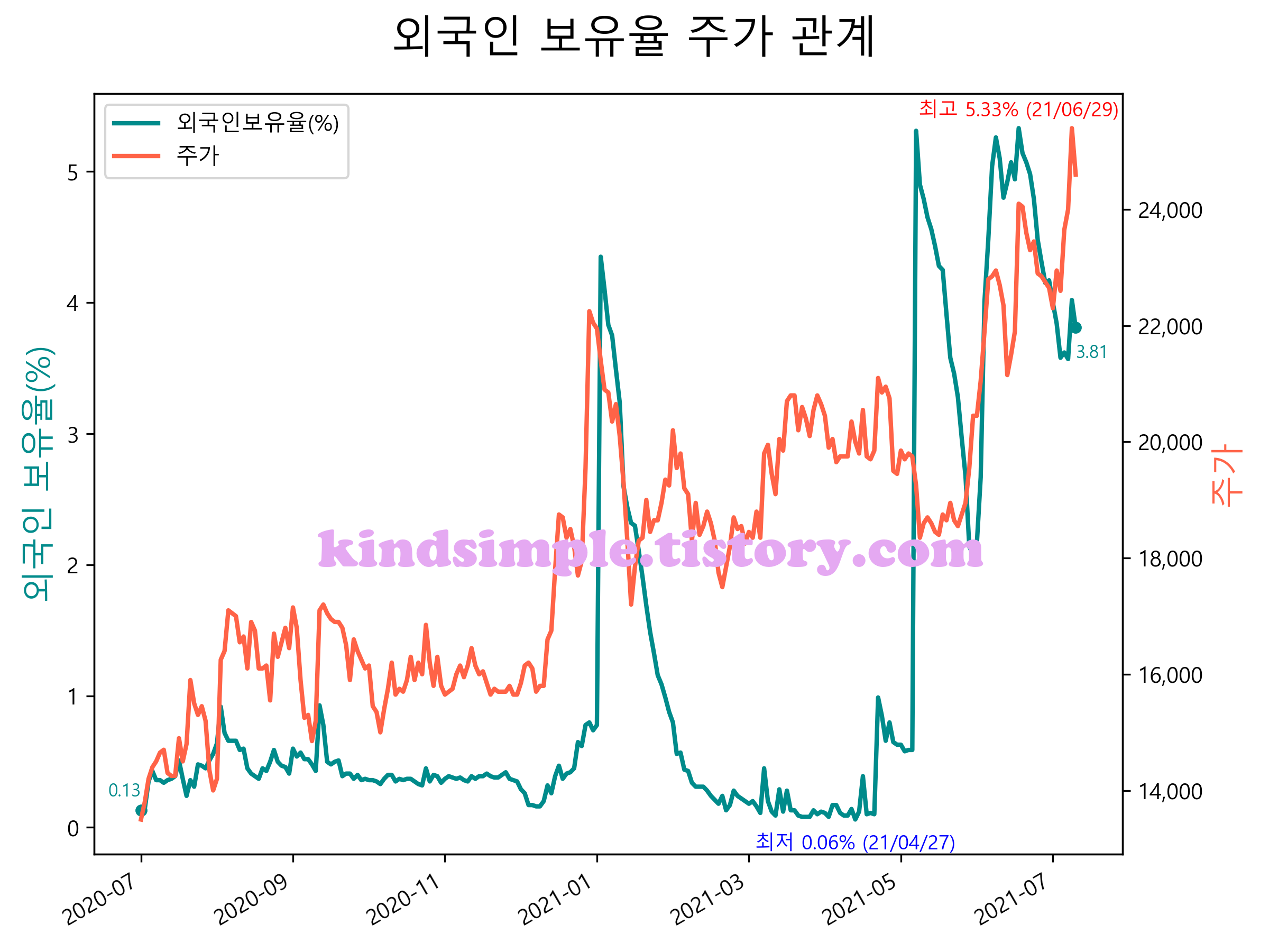 최근 1년간 외국인 보유율 및 주가와의 관계입니다.