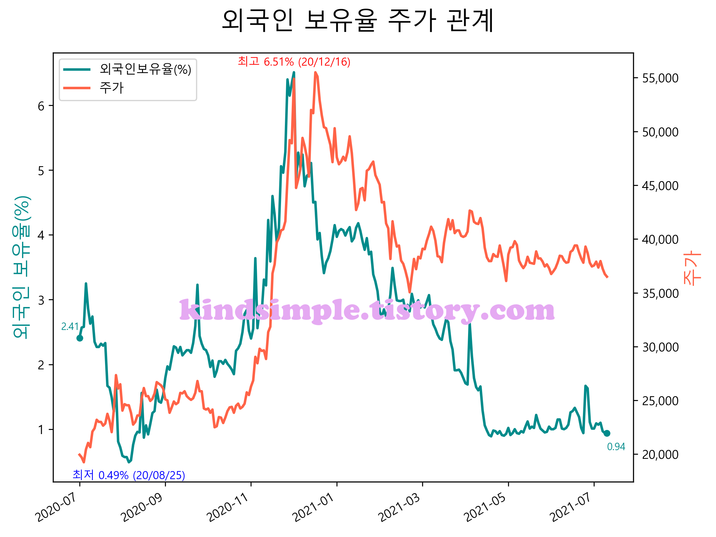 최근 1년간 외국인 보유율 및 주가와의 관계입니다.
