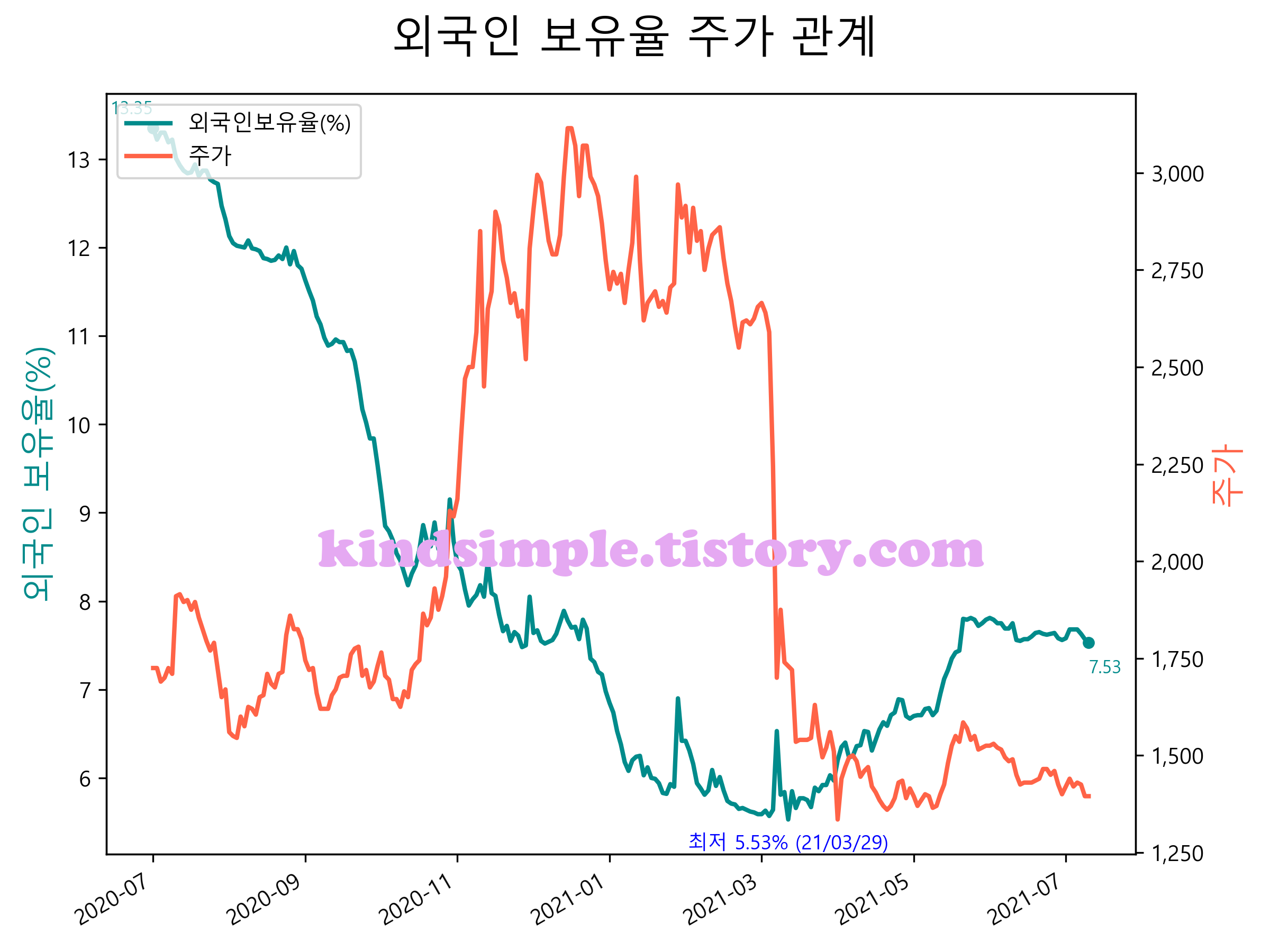 최근 1년간 외국인 보유율 및 주가와의 관계입니다.