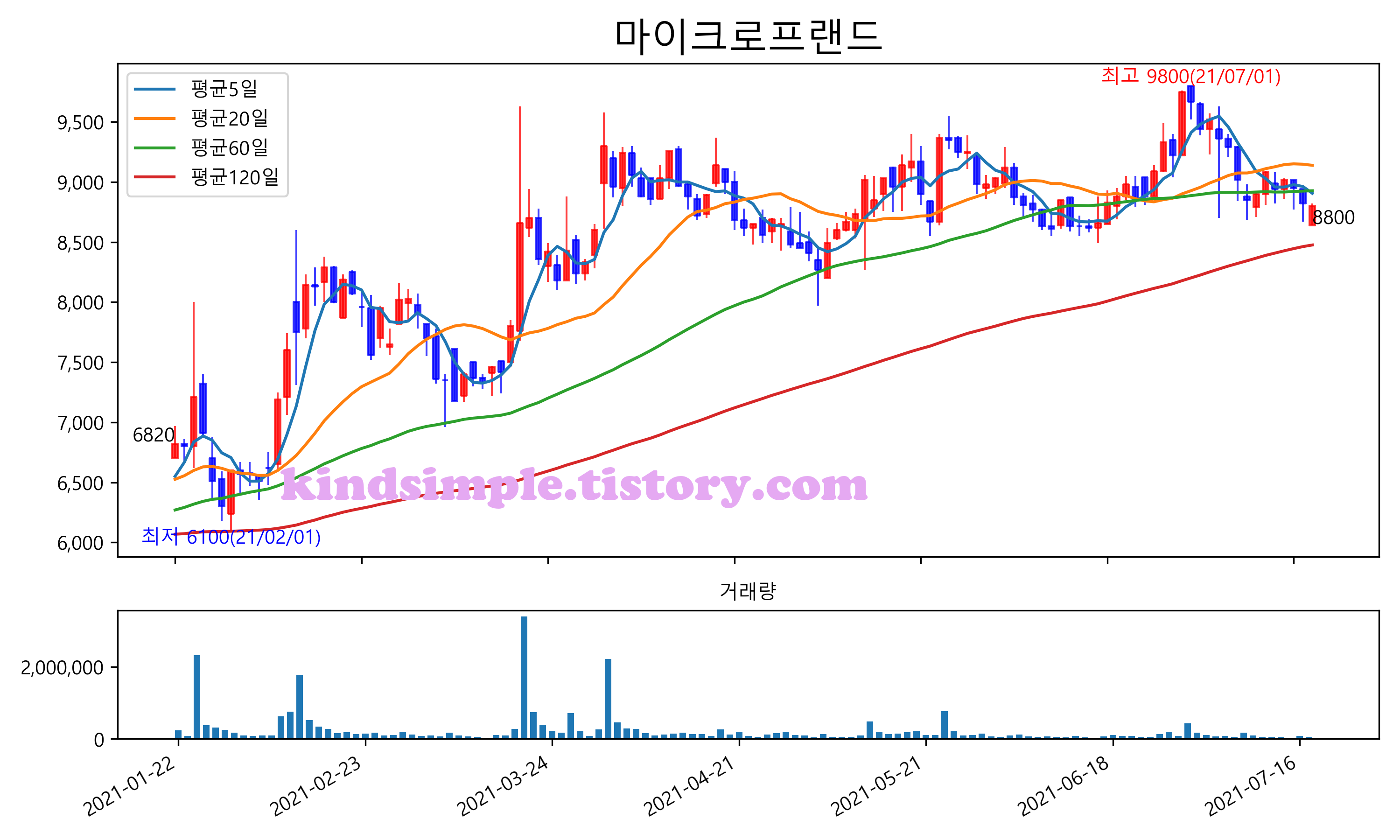 최근 6개월간 캔들차트 및 이동평균선입니다.