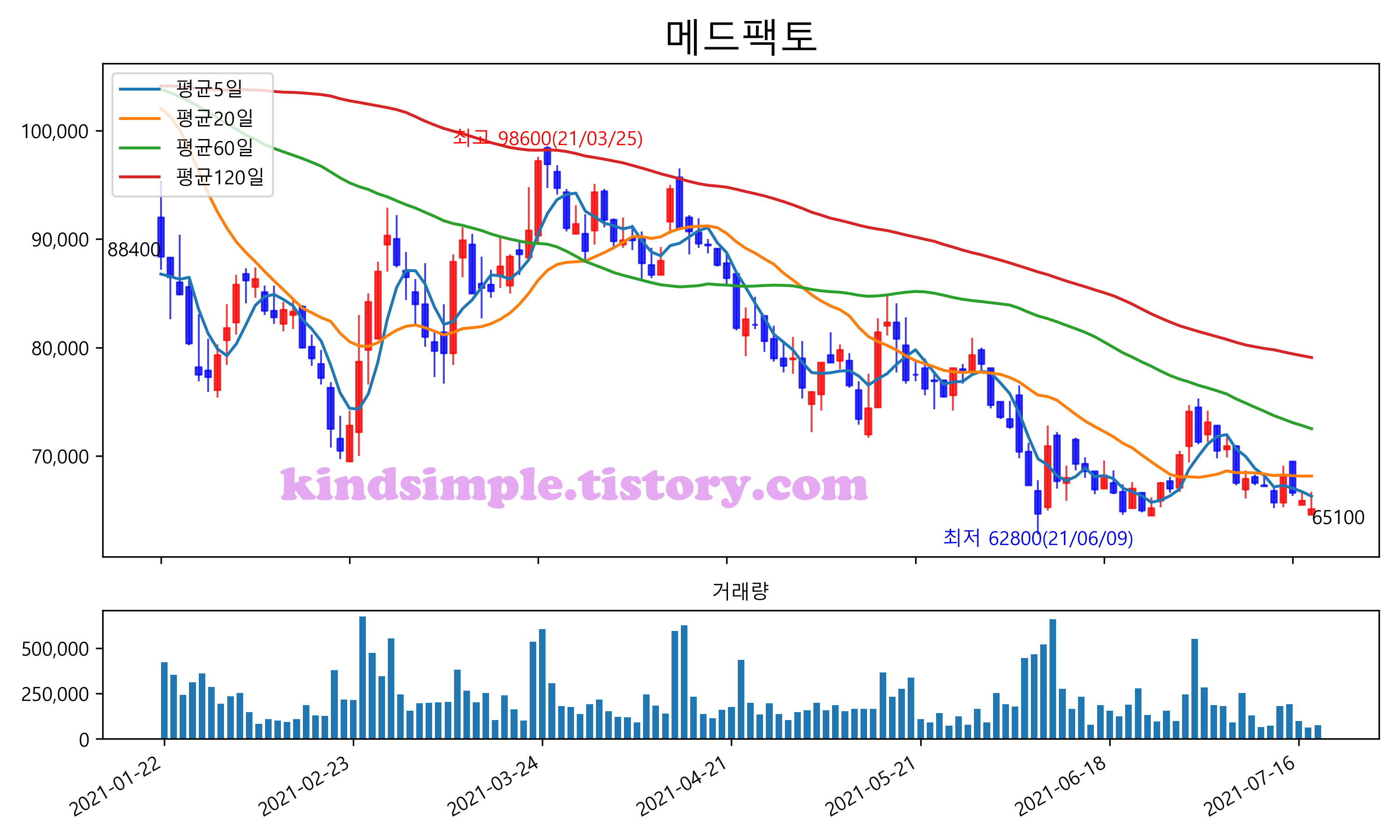 최근 6개월간 캔들차트 및 이동평균선입니다.