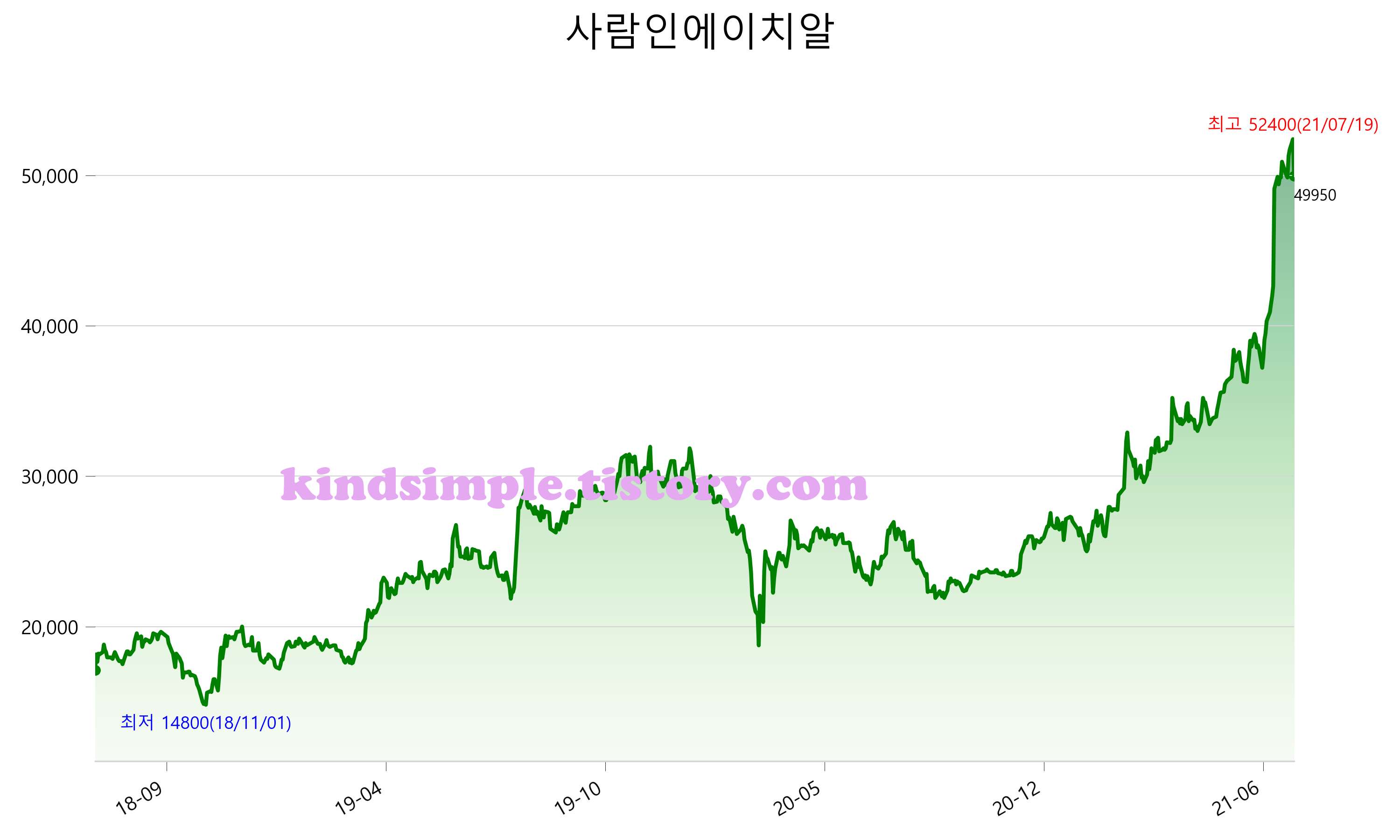 7월 21일 기준 주가는 49,950원 입니다. 아래는 최근 3년간의 주가흐름입니다.