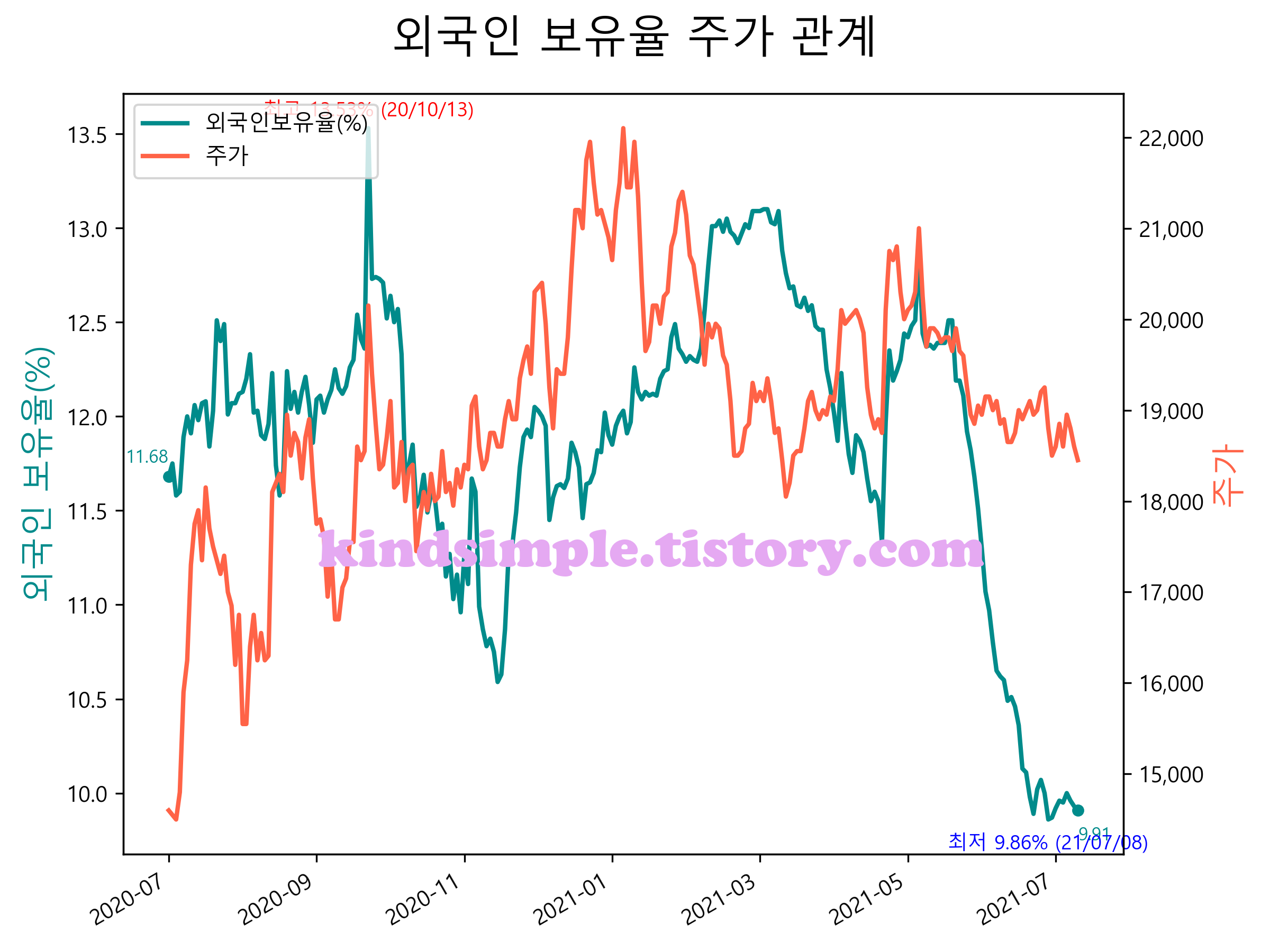 최근 1년간 외국인 보유율 및 주가와의 관계입니다.