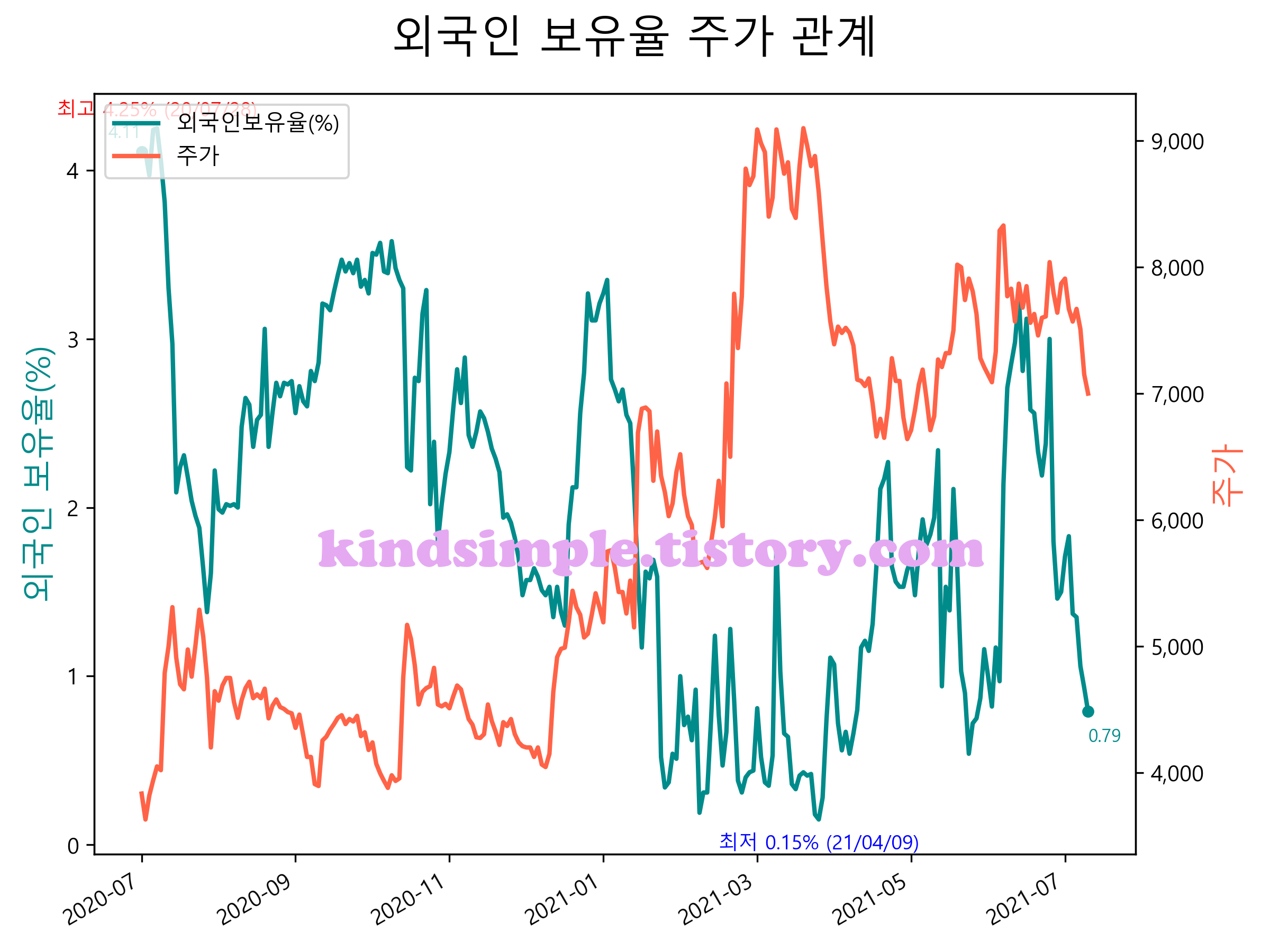 최근 1년간 외국인 보유율 및 주가와의 관계입니다.