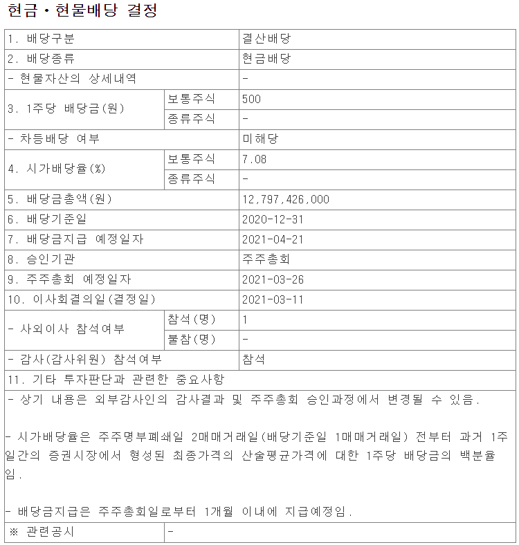 보통주는 500원이 배당되며, 시가배당율은 보통주는 7.08% 입니다. 배당금 총액은 127억원 규모입니다.