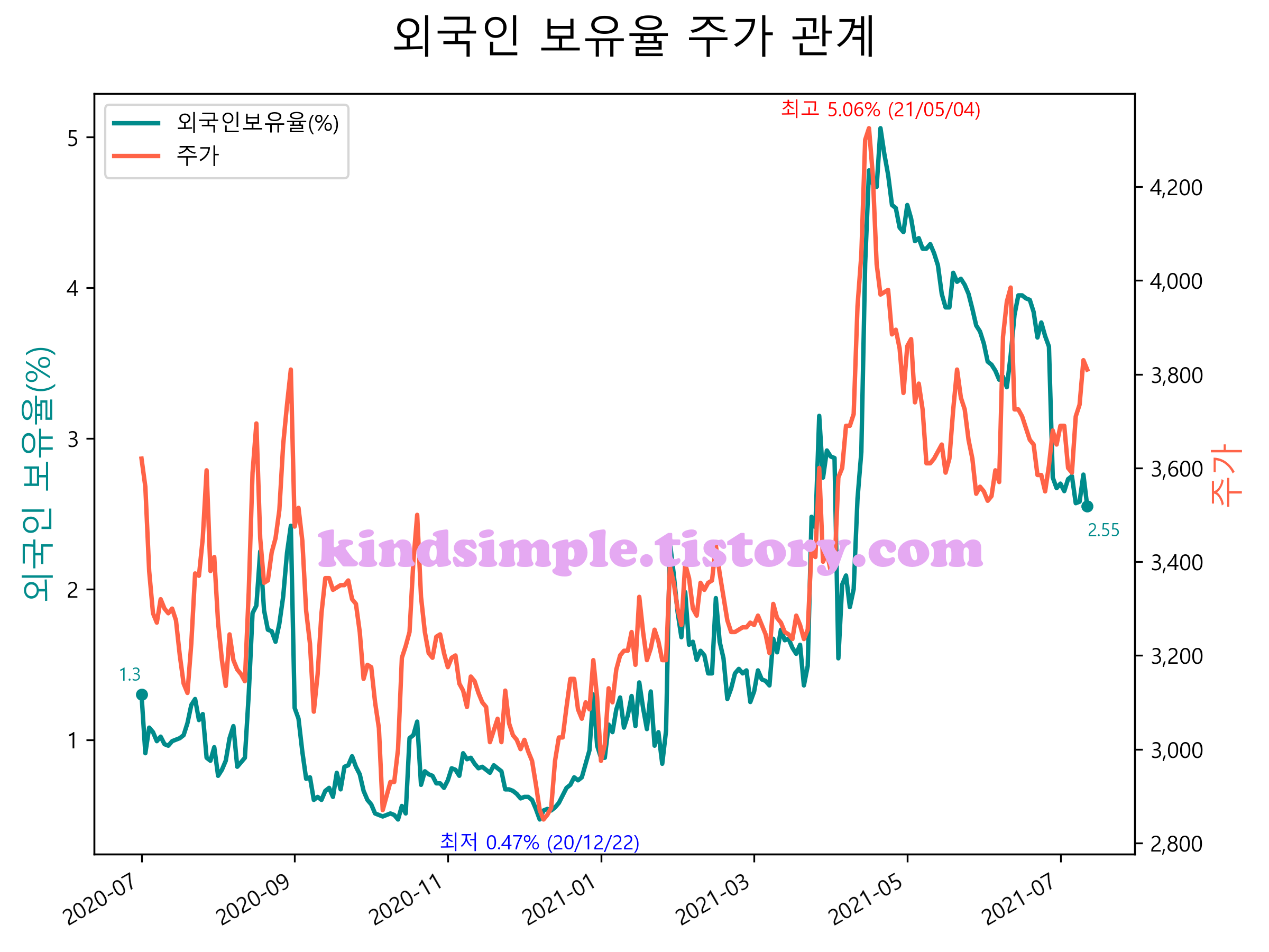 최근 1년간 외국인 보유율 및 주가와의 관계입니다.