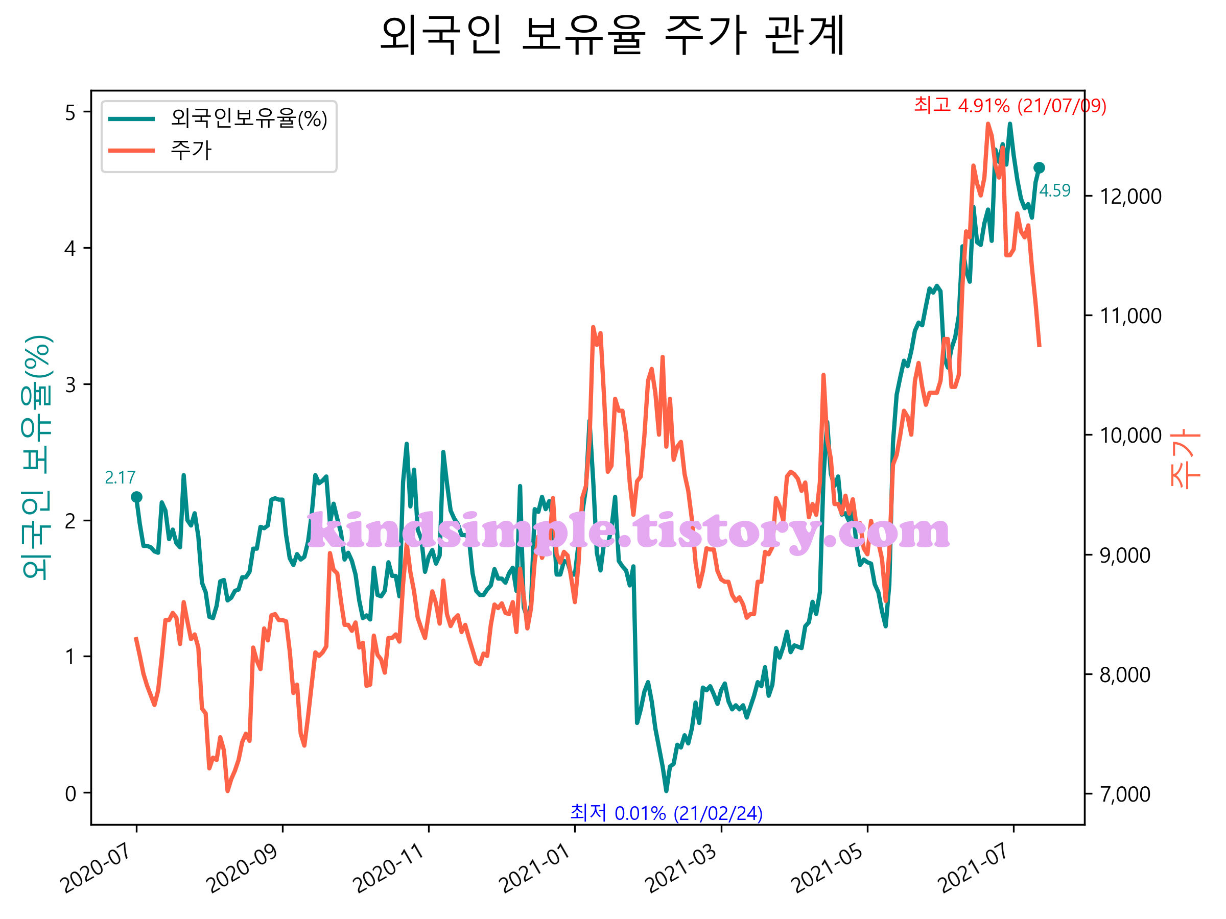 최근 1년간 외국인 보유율 및 주가와의 관계입니다.
