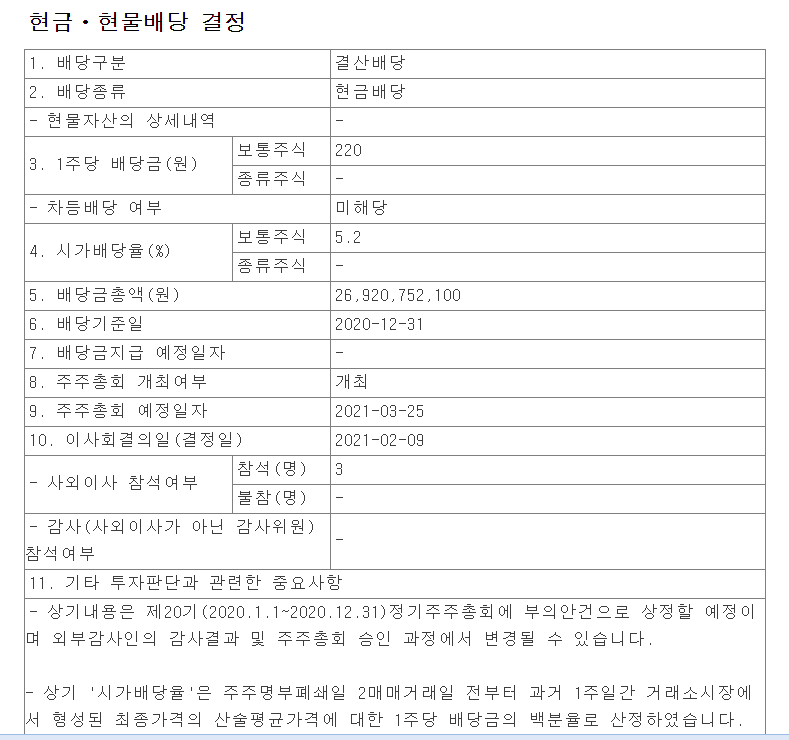2020년 배당금은 주당 220원 입니다. 작년 배당금인 182원보다 20.9% 증가했습니다.
