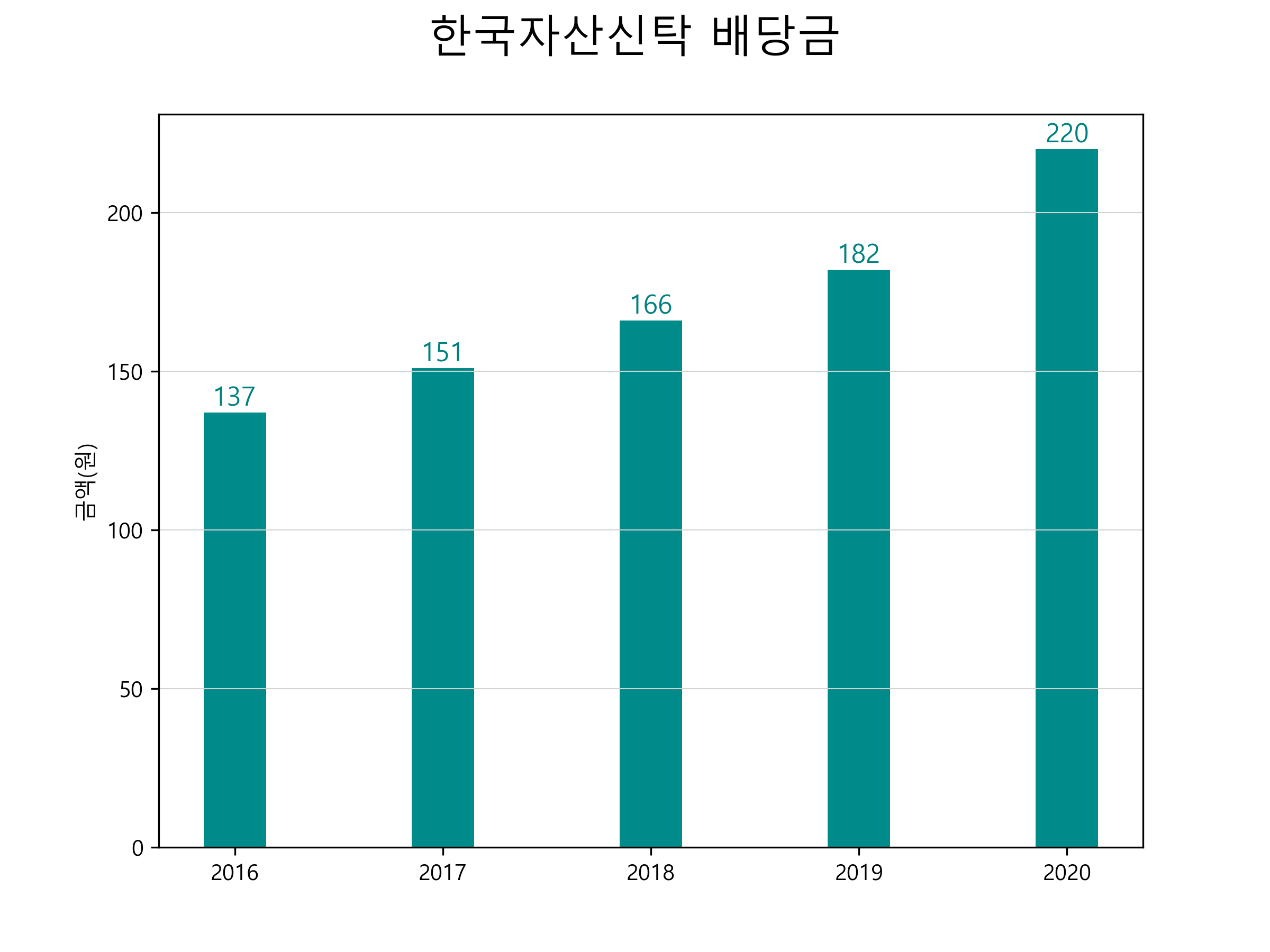 한국자산신탁은 1년에 1번 배당을 실시하고 있으며 2021년 4월 중에 배당금을 지급합니다.