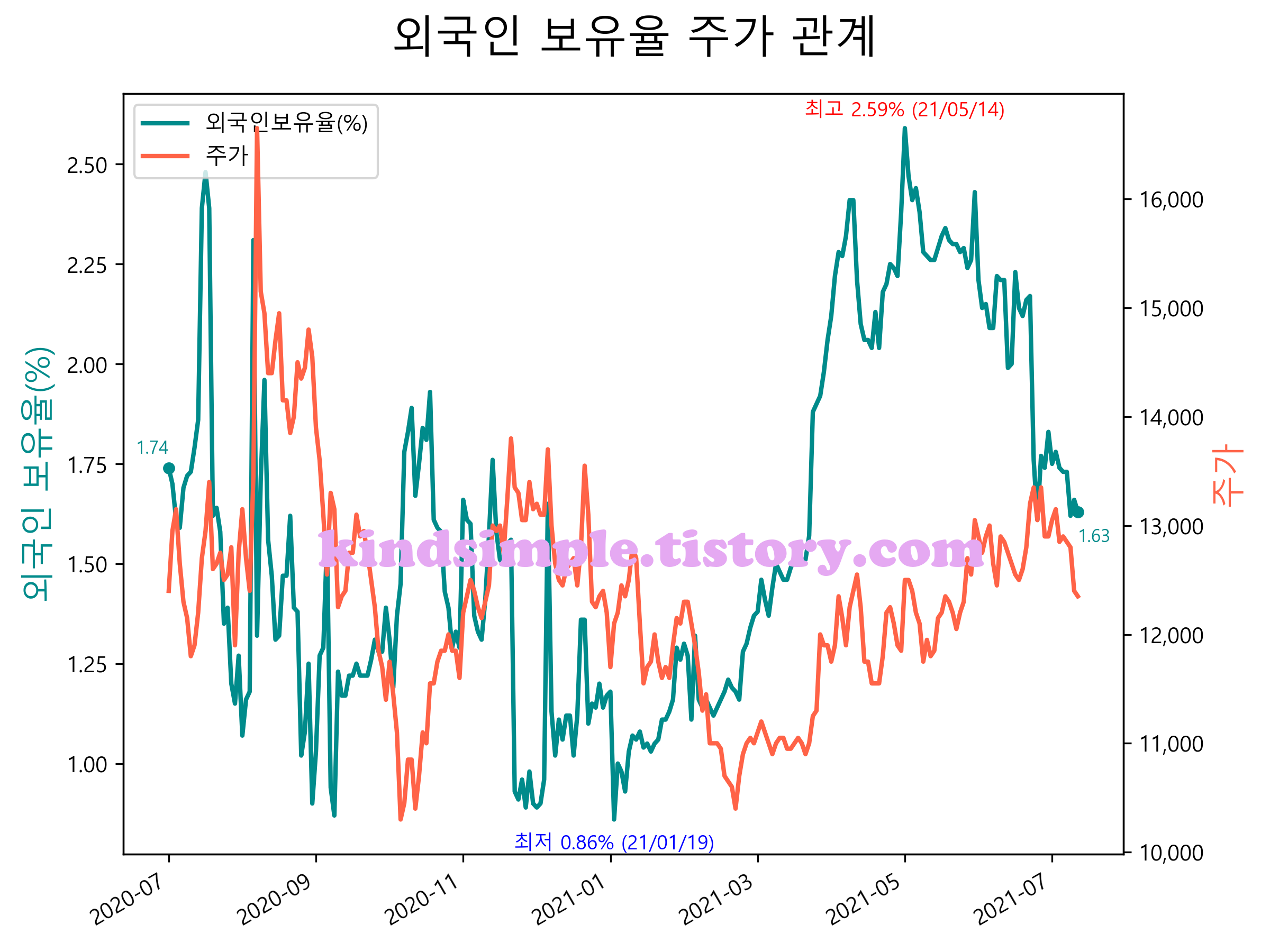 최근 1년간 외국인 보유율 및 주가와의 관계입니다.