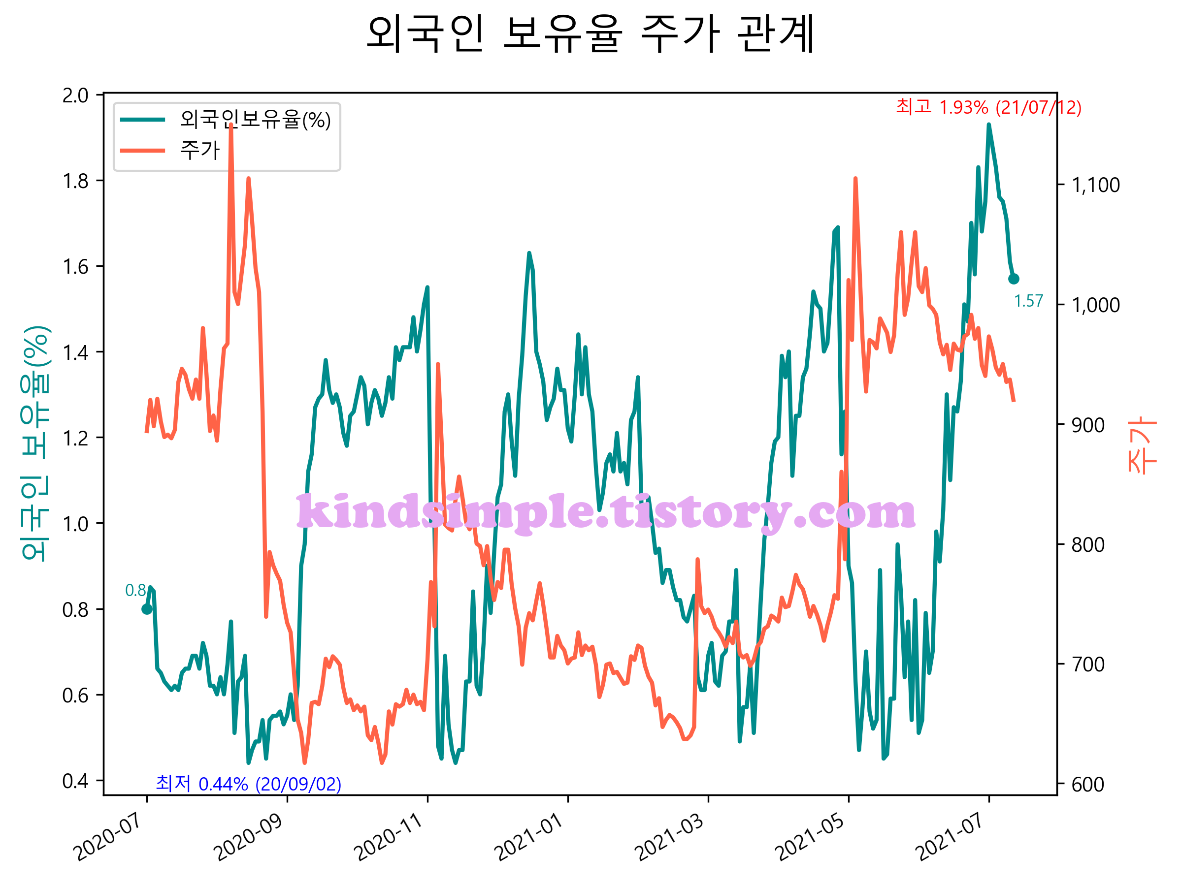 최근 1년간 외국인 보유율 및 주가와의 관계입니다.