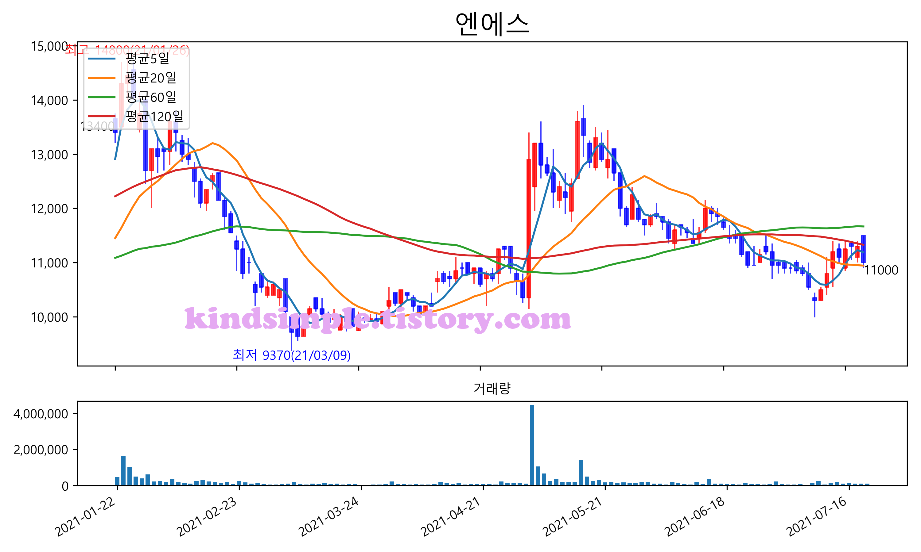 최근 6개월간 캔들차트 및 이동평균선입니다.