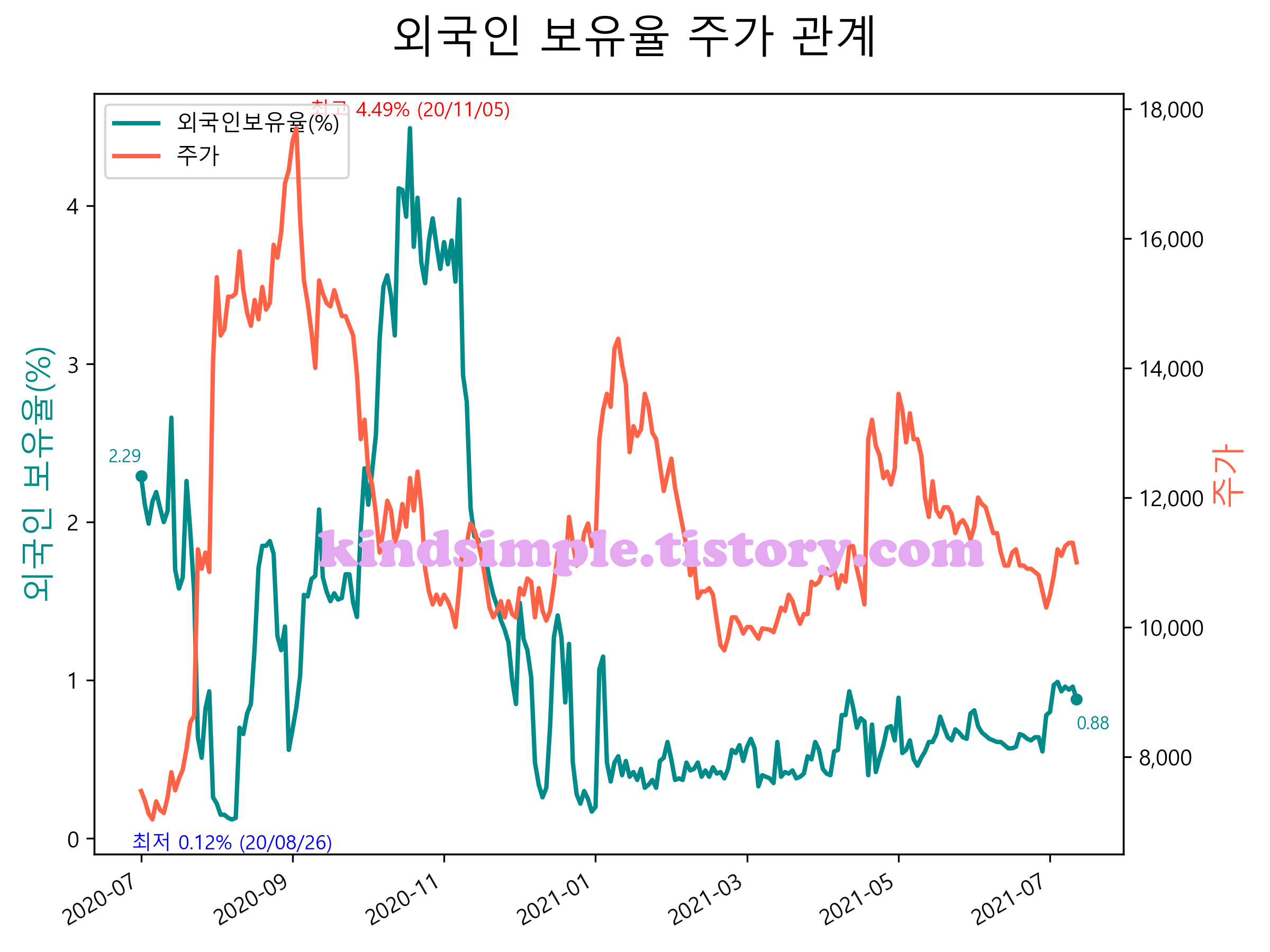 최근 1년간 외국인 보유율 및 주가와의 관계입니다.