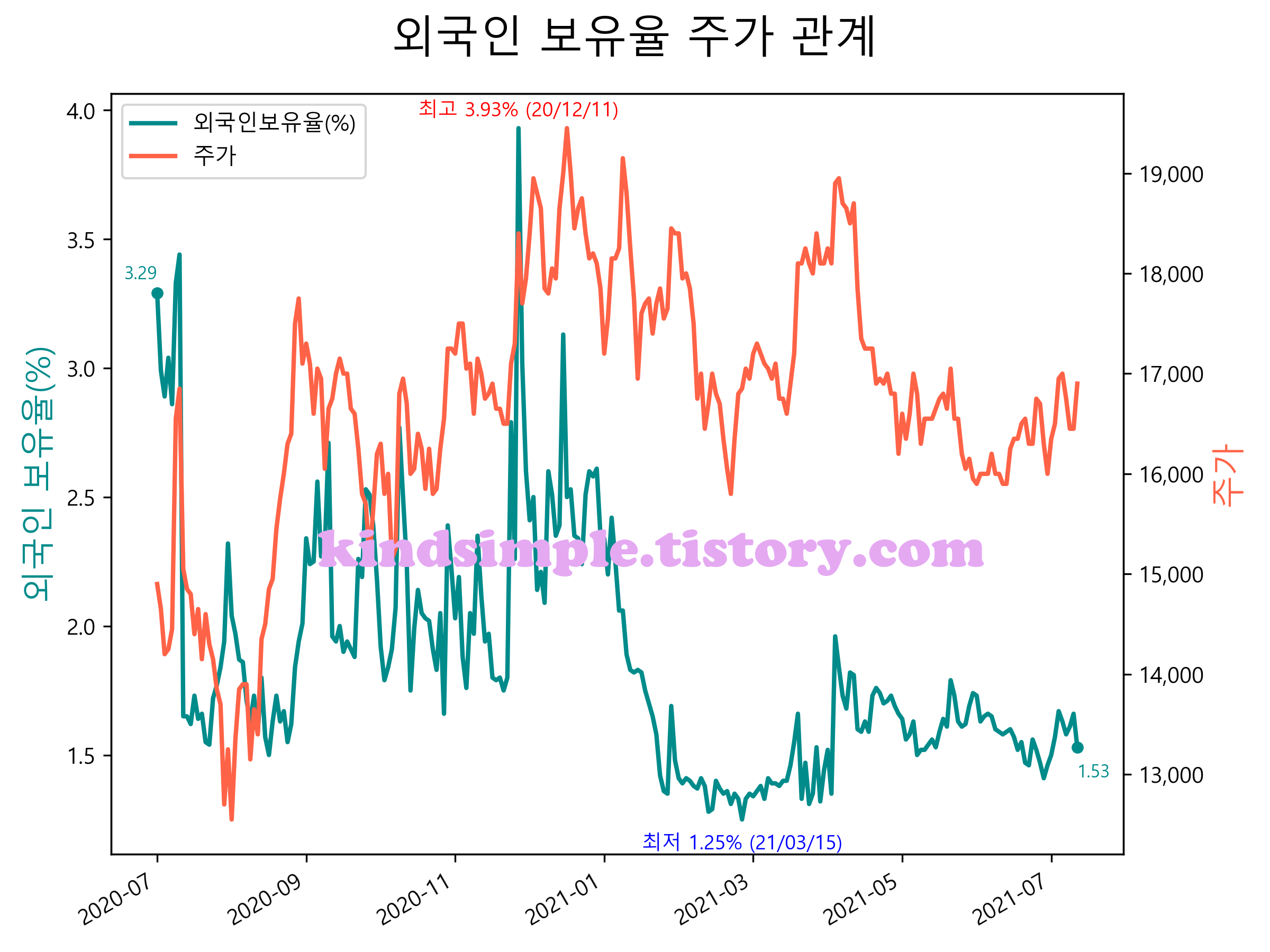 최근 1년간 외국인 보유율 및 주가와의 관계입니다.