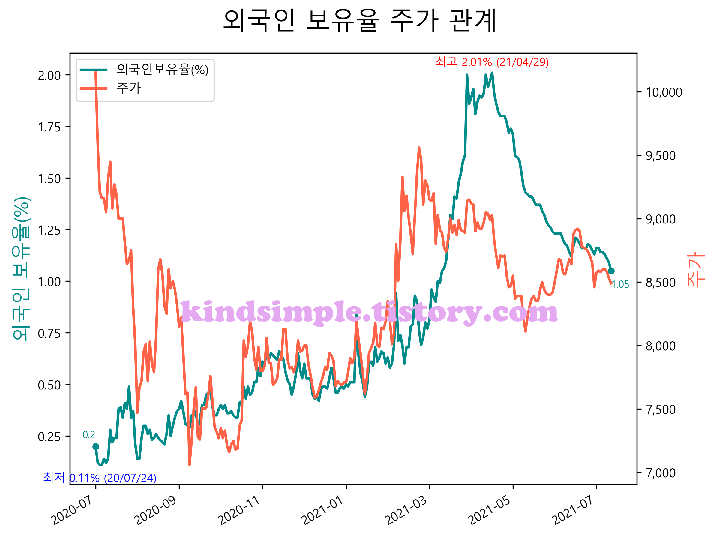 최근 1년간 외국인 보유율 및 주가와의 관계입니다.