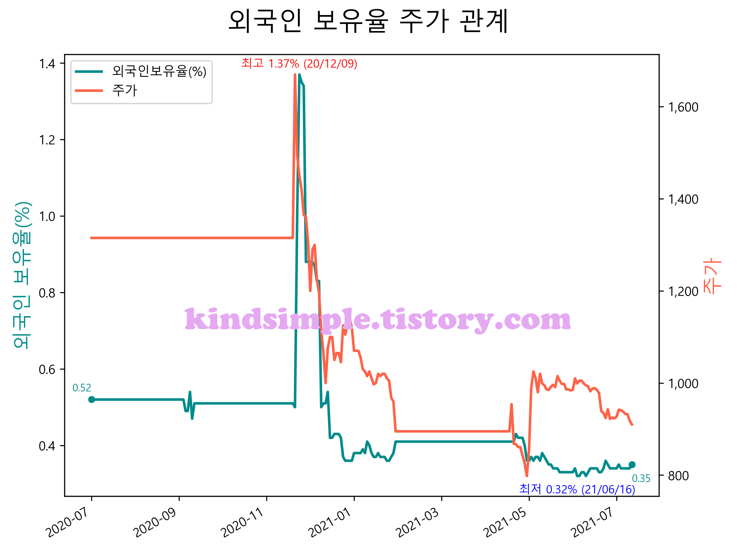 최근 1년간 외국인 보유율 및 주가와의 관계입니다.