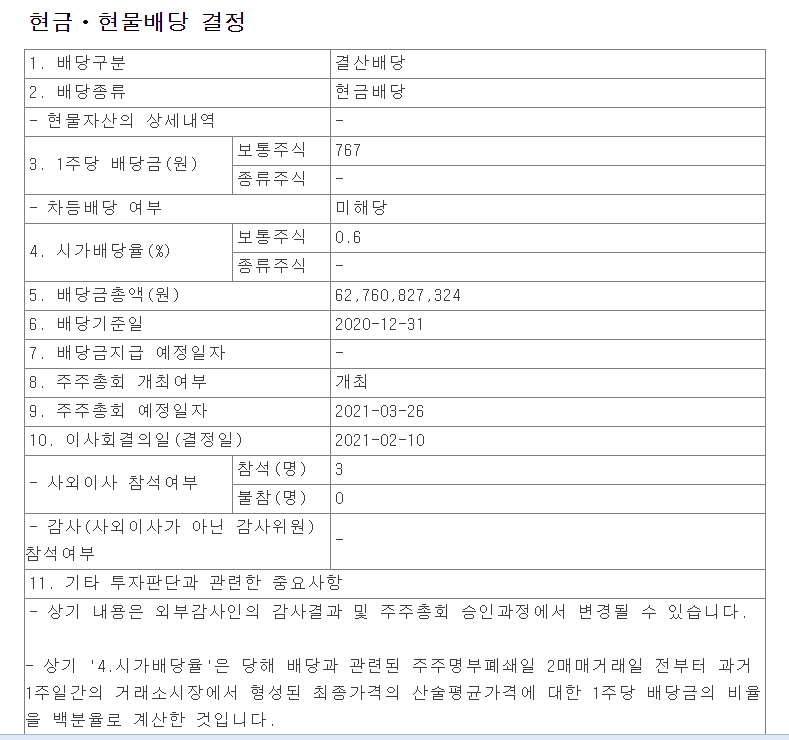 2020년 배당금은 주당 767원 입니다. 2017년 이래로 3년만에 배당을 실시합니다.