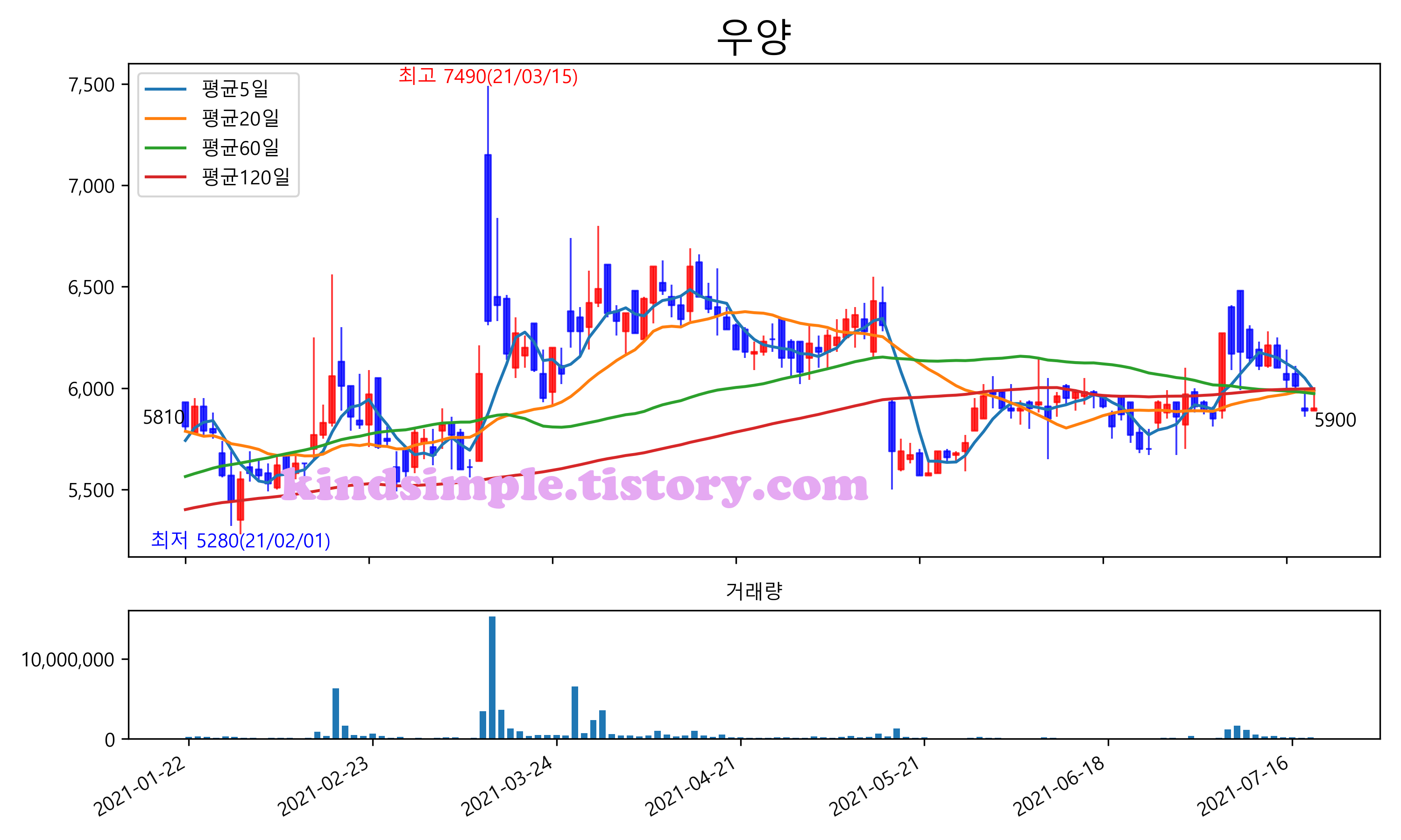 최근 6개월간 캔들차트 및 이동평균선입니다.