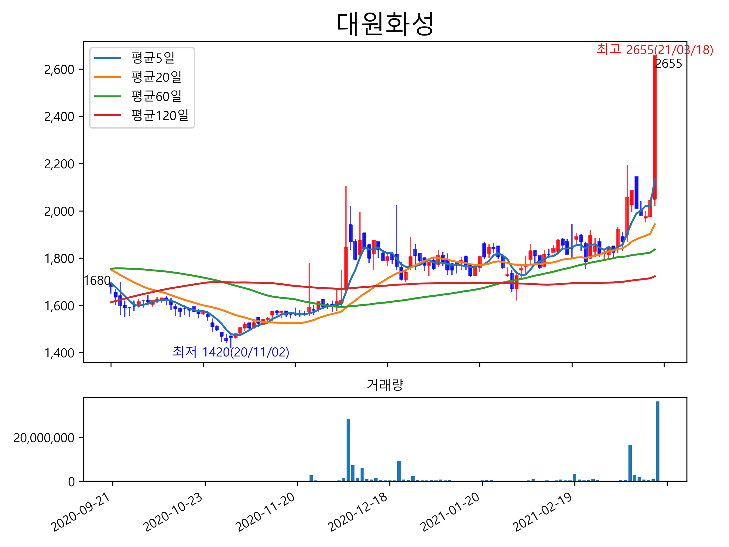최근 6개월간 캔들차트 및 이동평균선입니다.