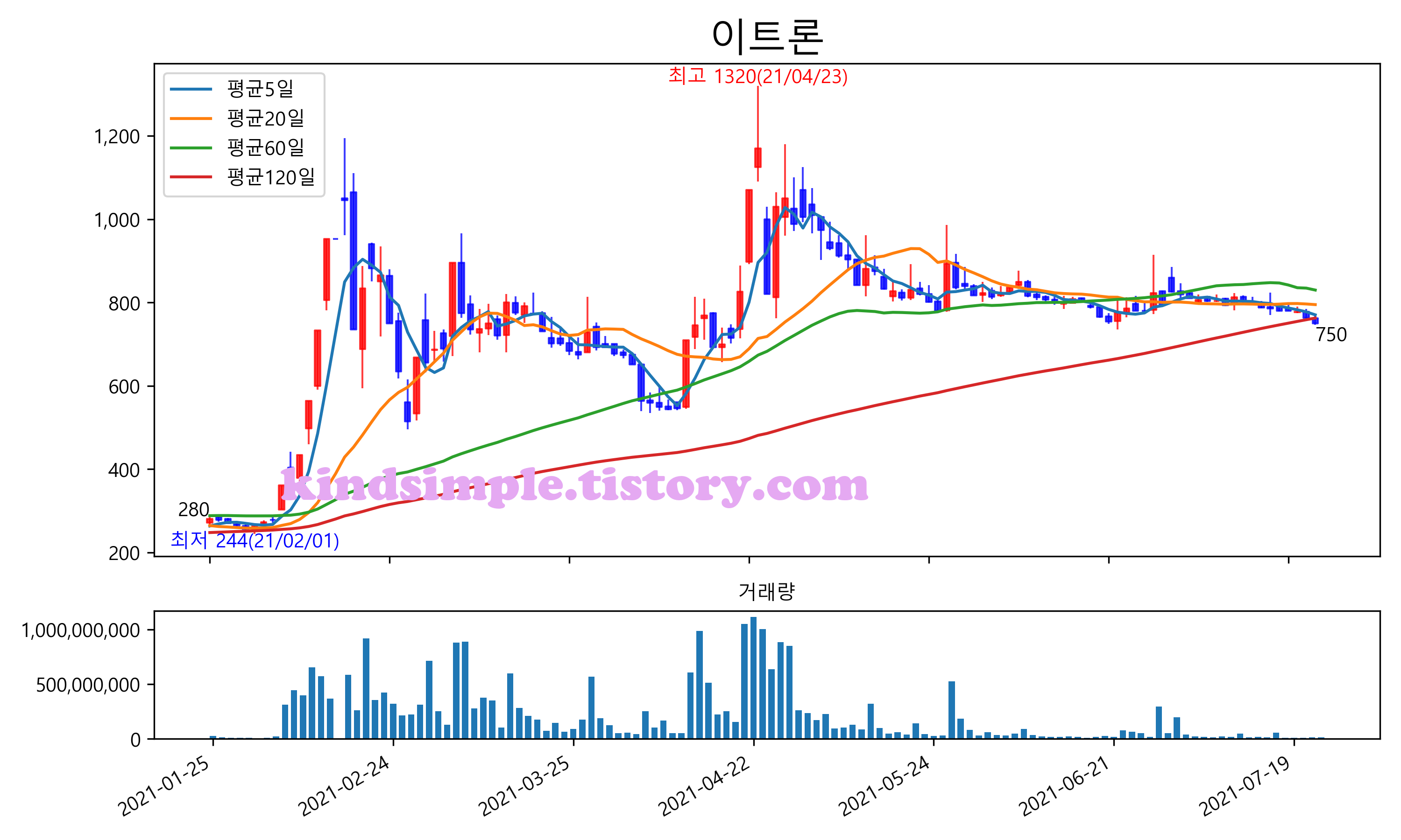 최근 6개월간 캔들차트 및 이동평균선입니다.
