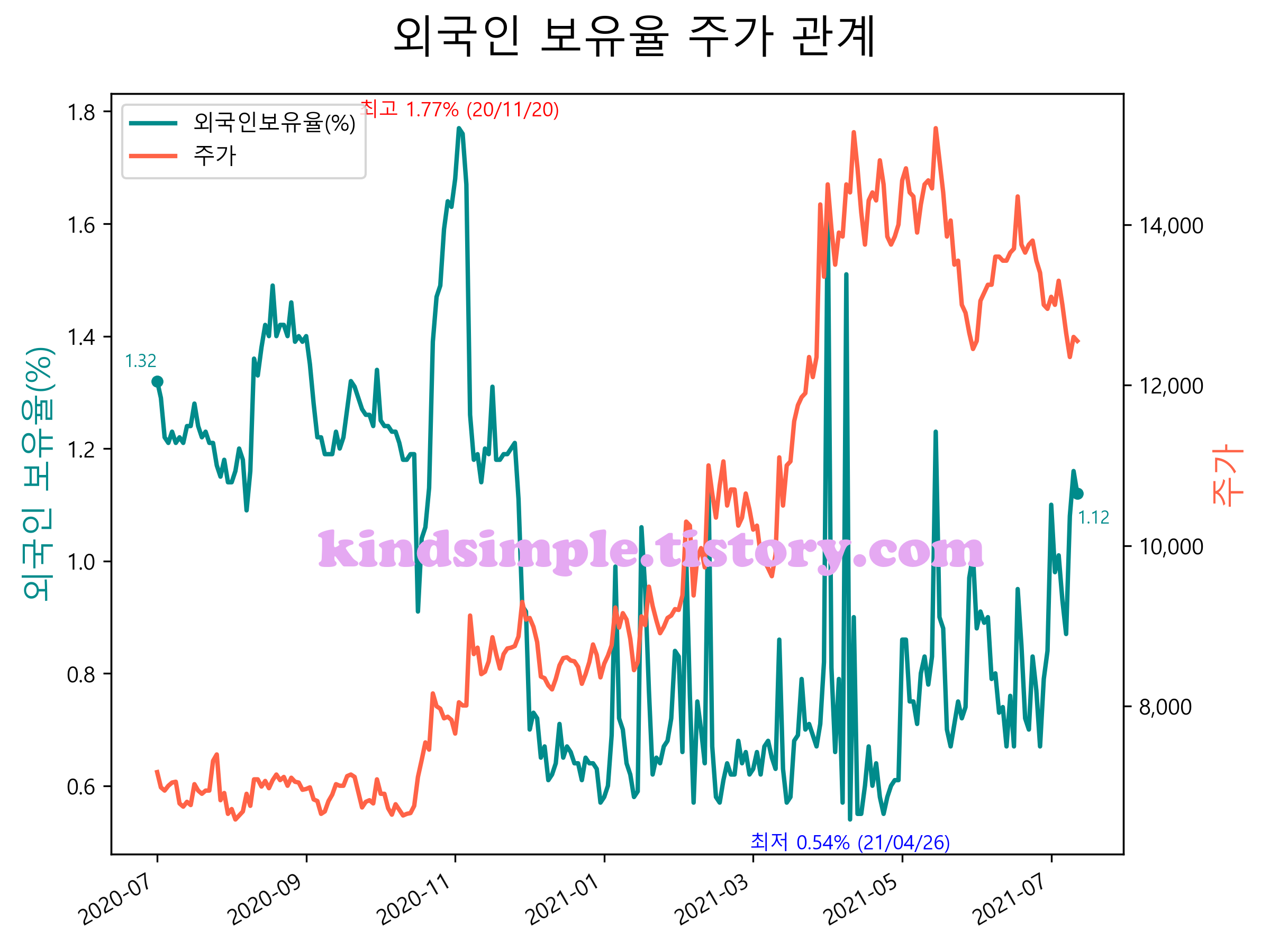 최근 1년간 외국인 보유율 및 주가와의 관계입니다.