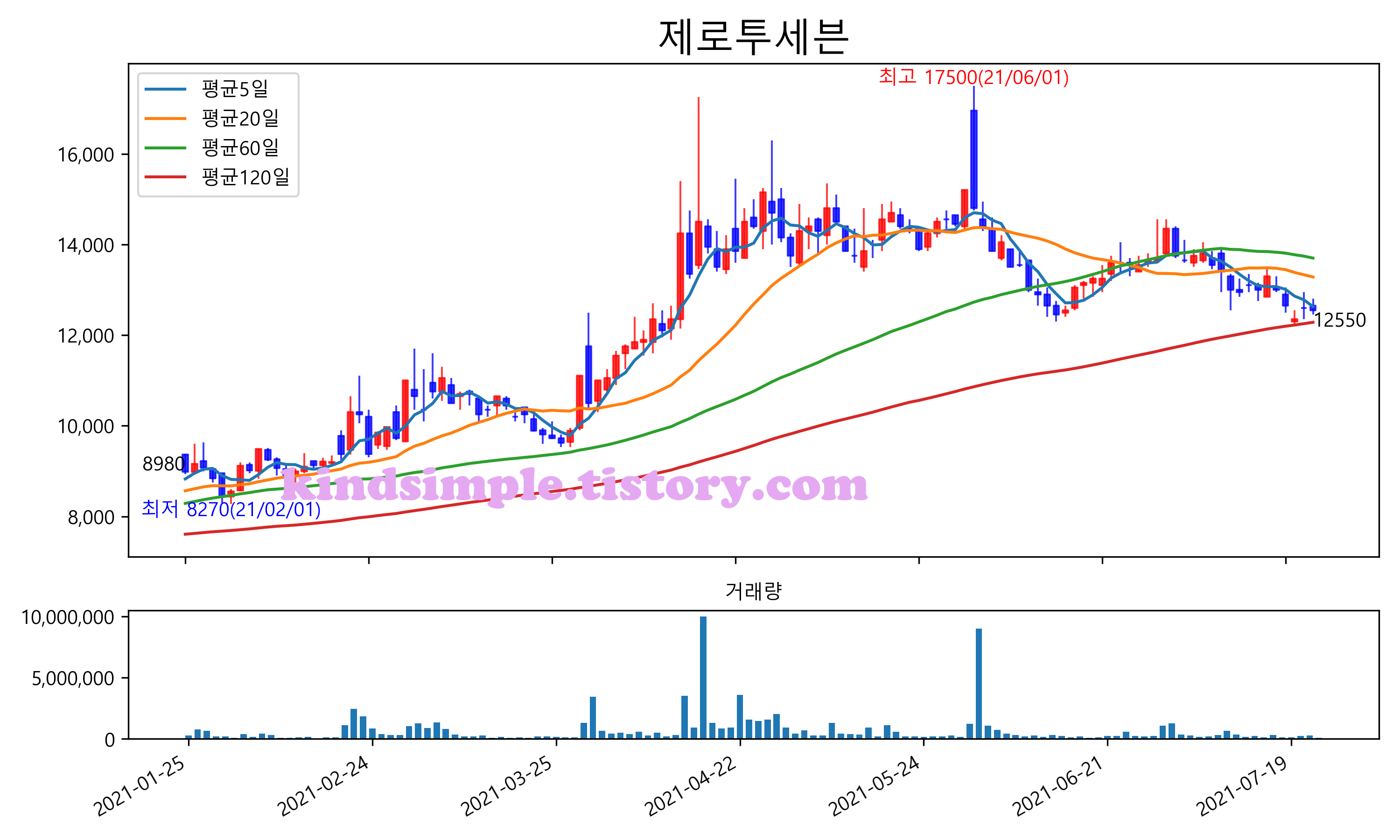 최근 6개월간 캔들차트 및 이동평균선입니다.