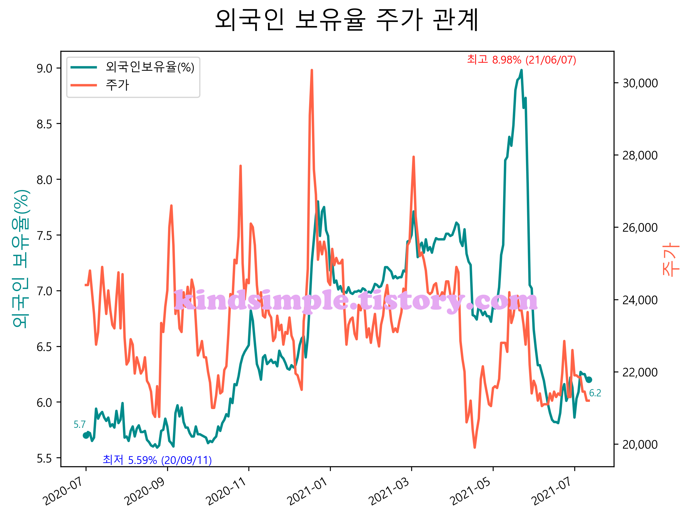 최근 1년간 외국인 보유율 및 주가와의 관계입니다.