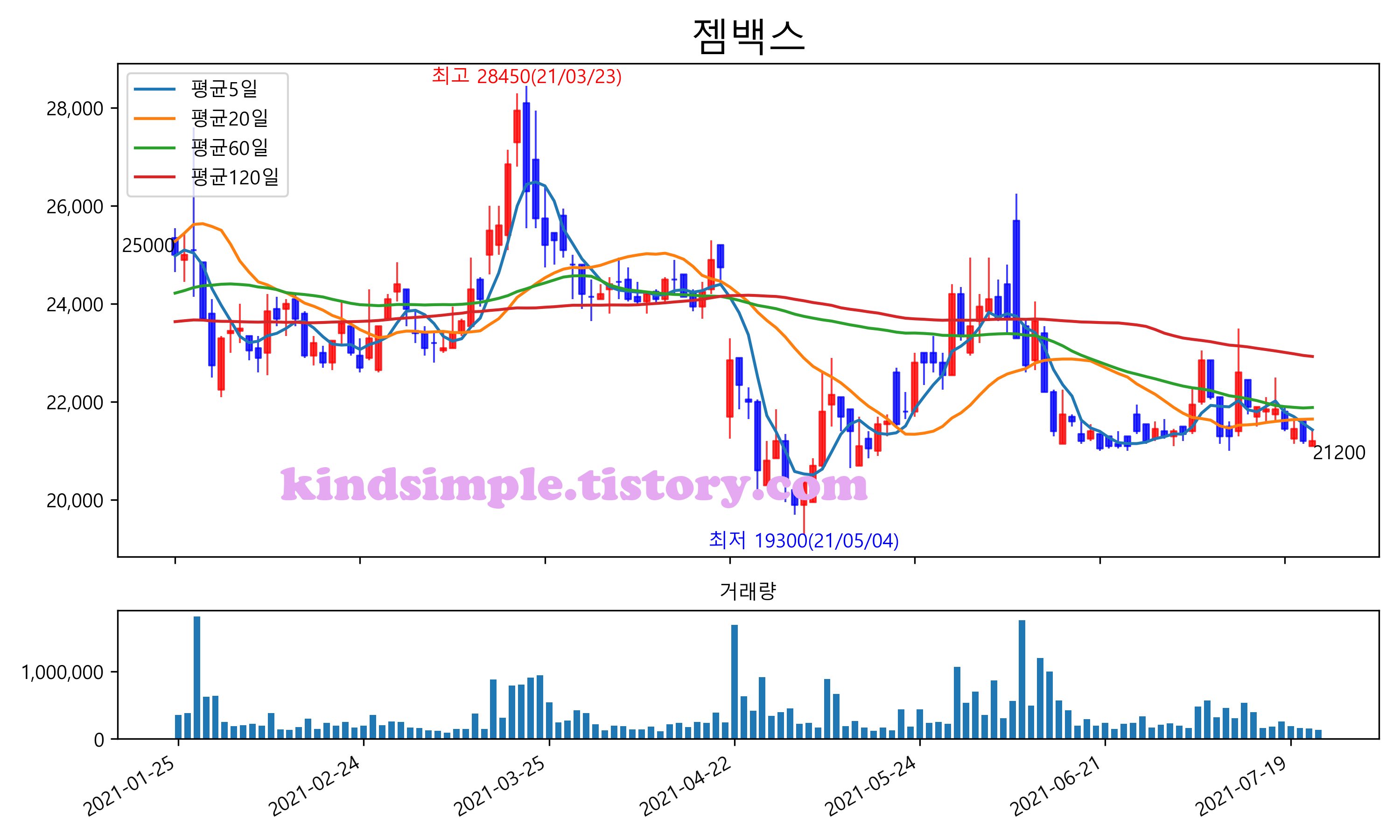 최근 6개월간 캔들차트 및 이동평균선입니다.