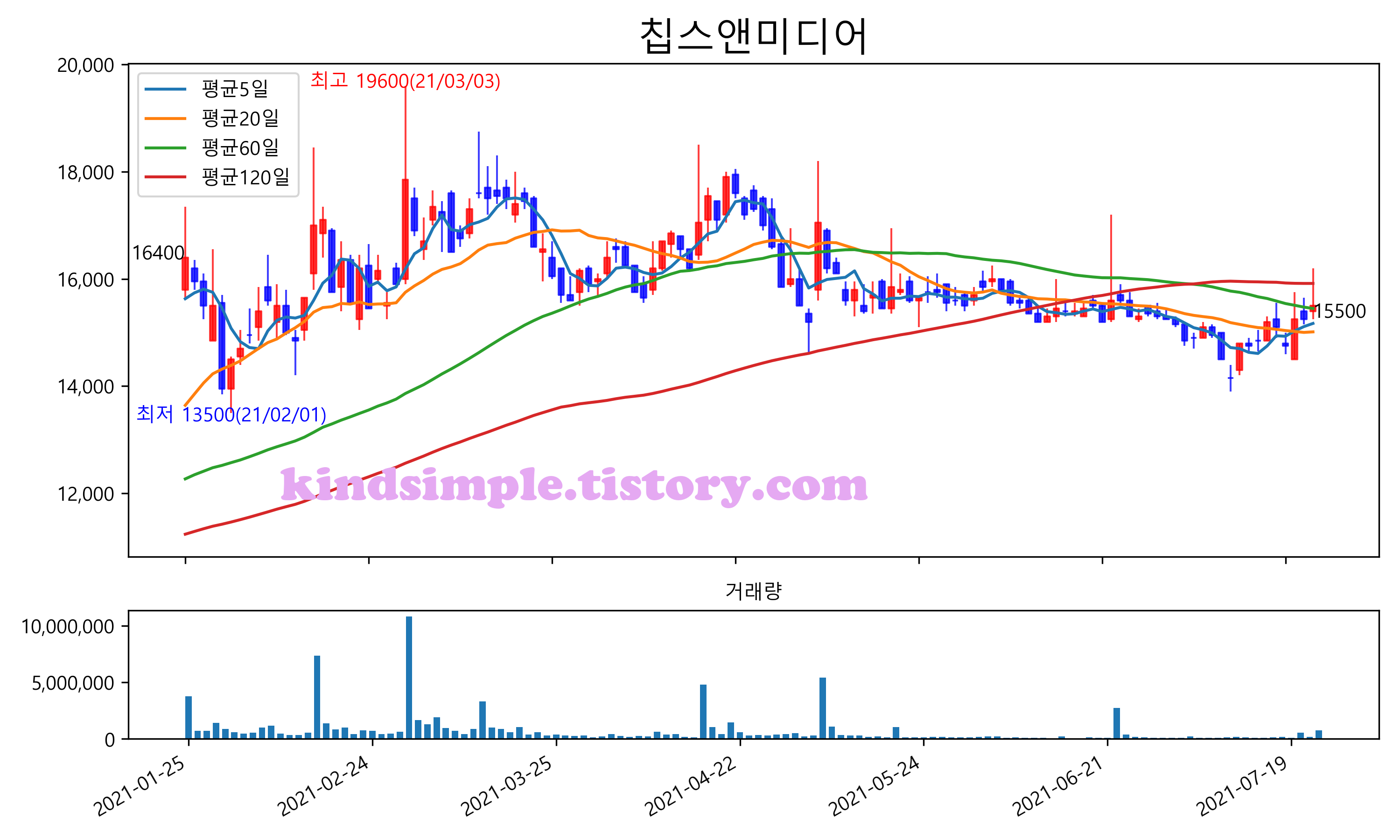 최근 6개월간 캔들차트 및 이동평균선입니다.