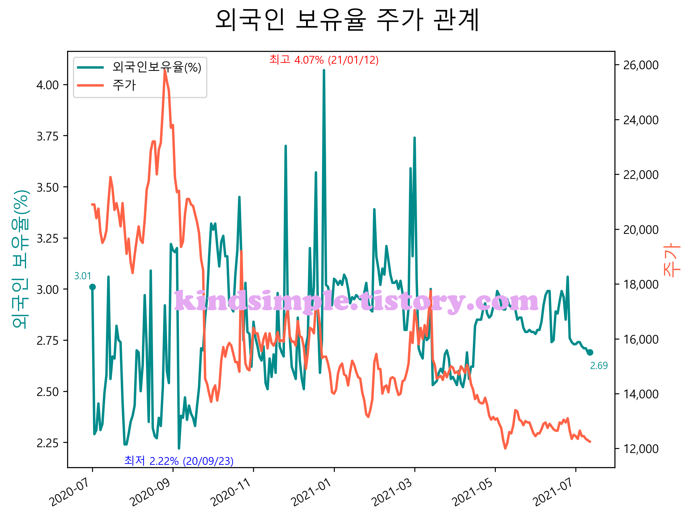 최근 1년간 외국인 보유율 및 주가와의 관계입니다.