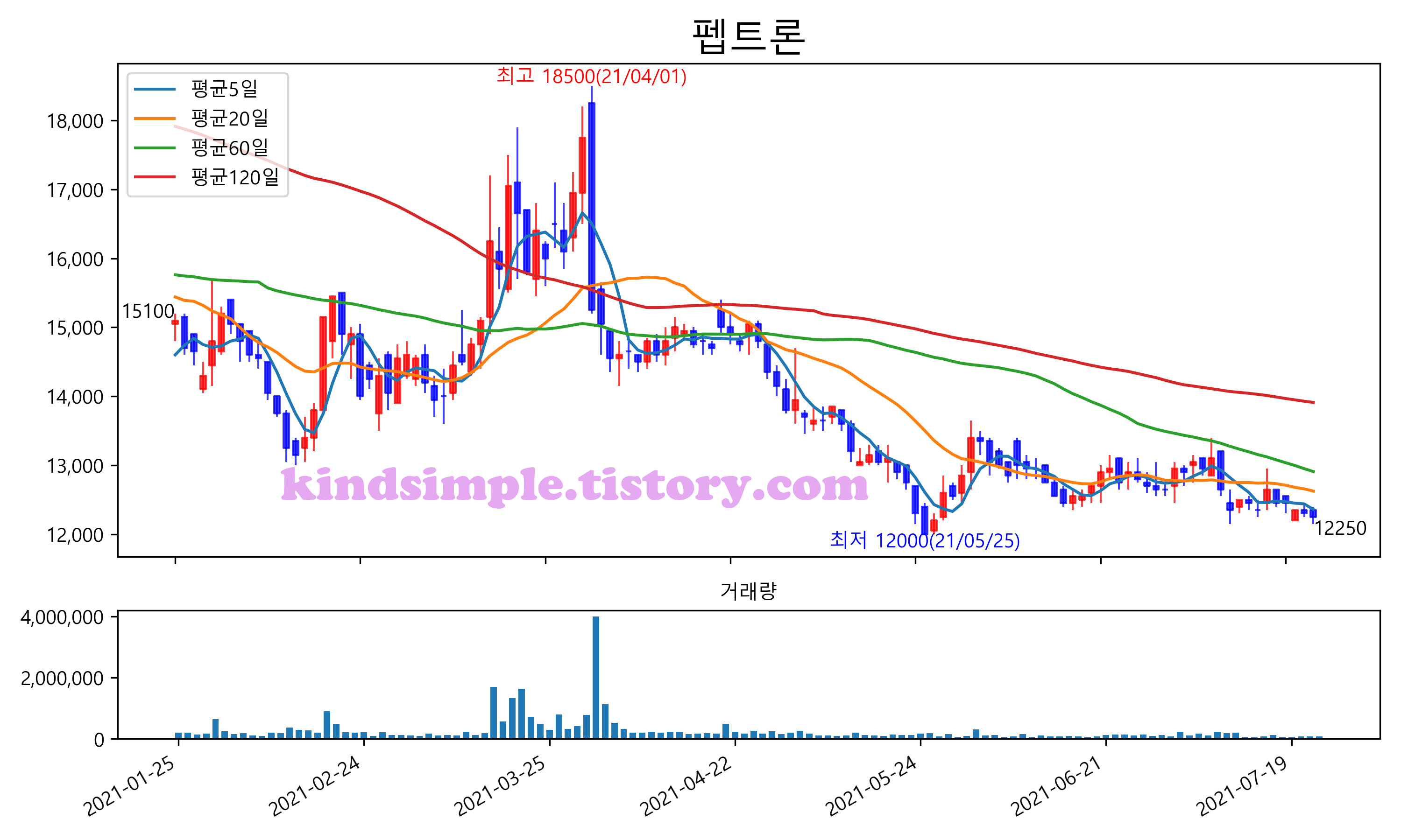 최근 6개월간 캔들차트 및 이동평균선입니다.