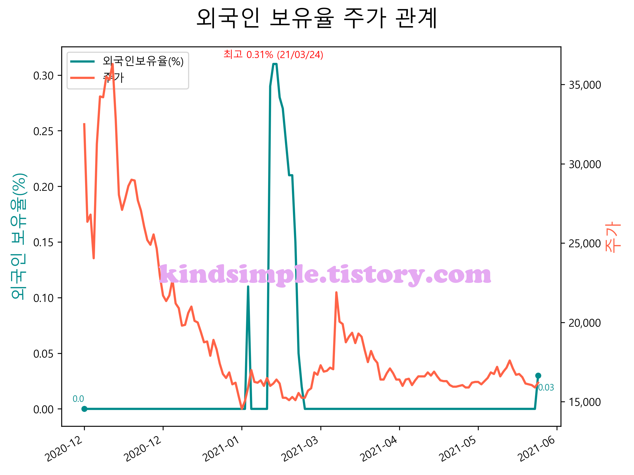 최근 1년간 외국인 보유율 및 주가와의 관계입니다.