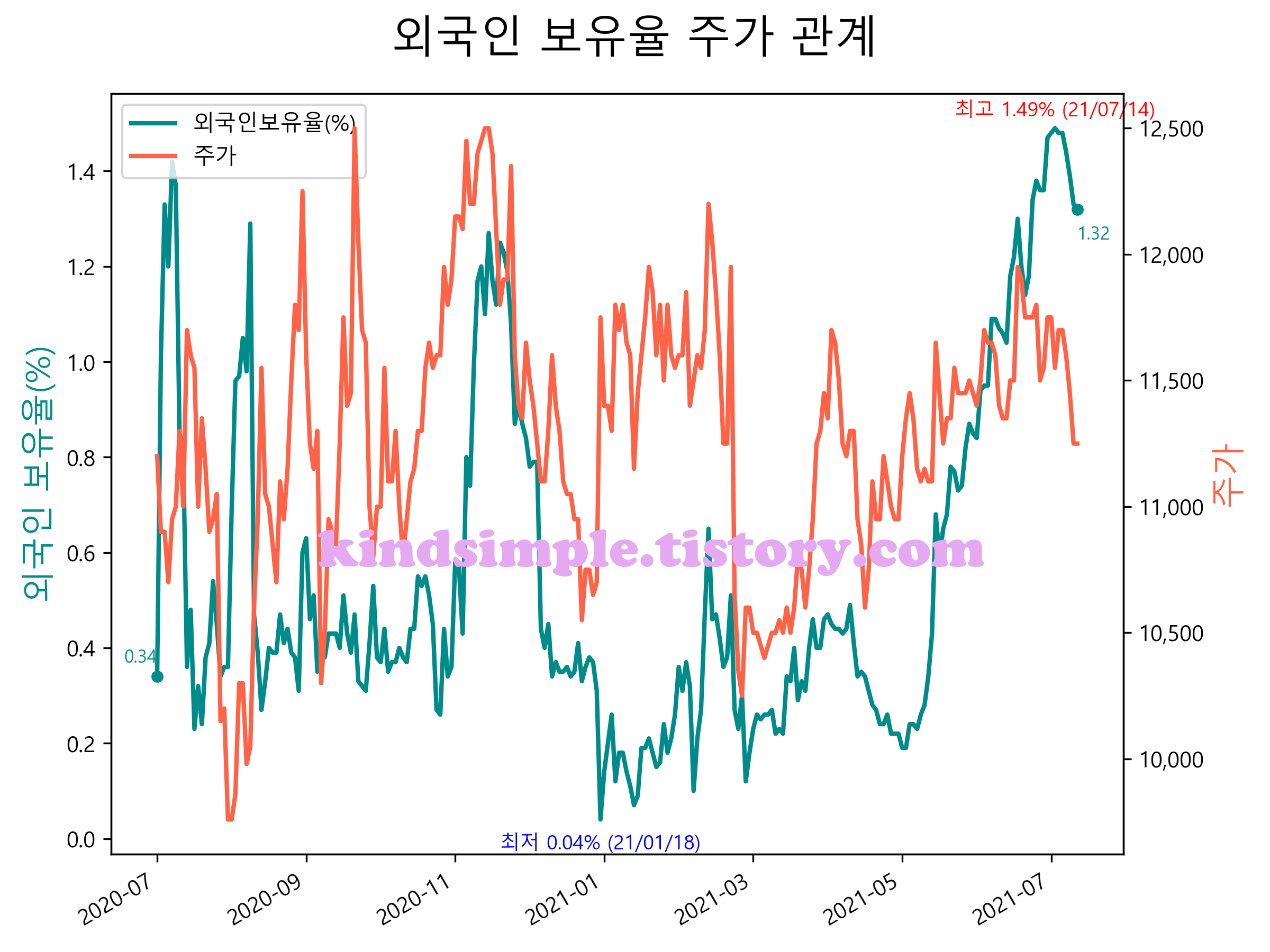 최근 1년간 외국인 보유율 및 주가와의 관계입니다.