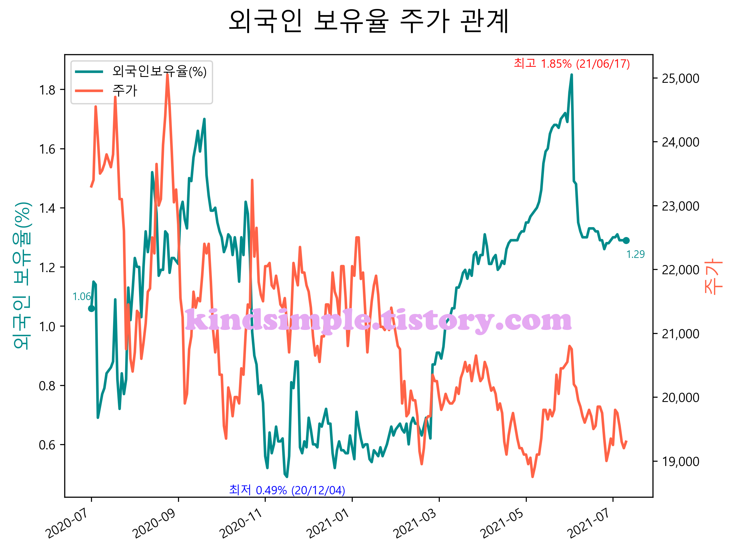 최근 1년간 외국인 보유율 및 주가와의 관계입니다.