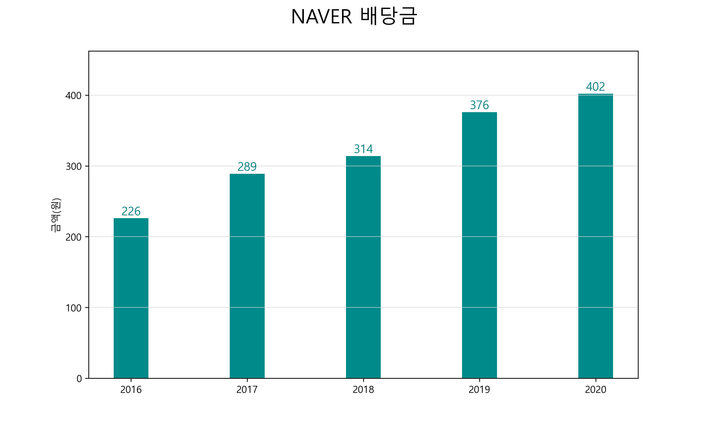 네이버은 1년에 1번 배당을 실시하고 있으며 2021년 4월 중에 배당금을 지급합니다.