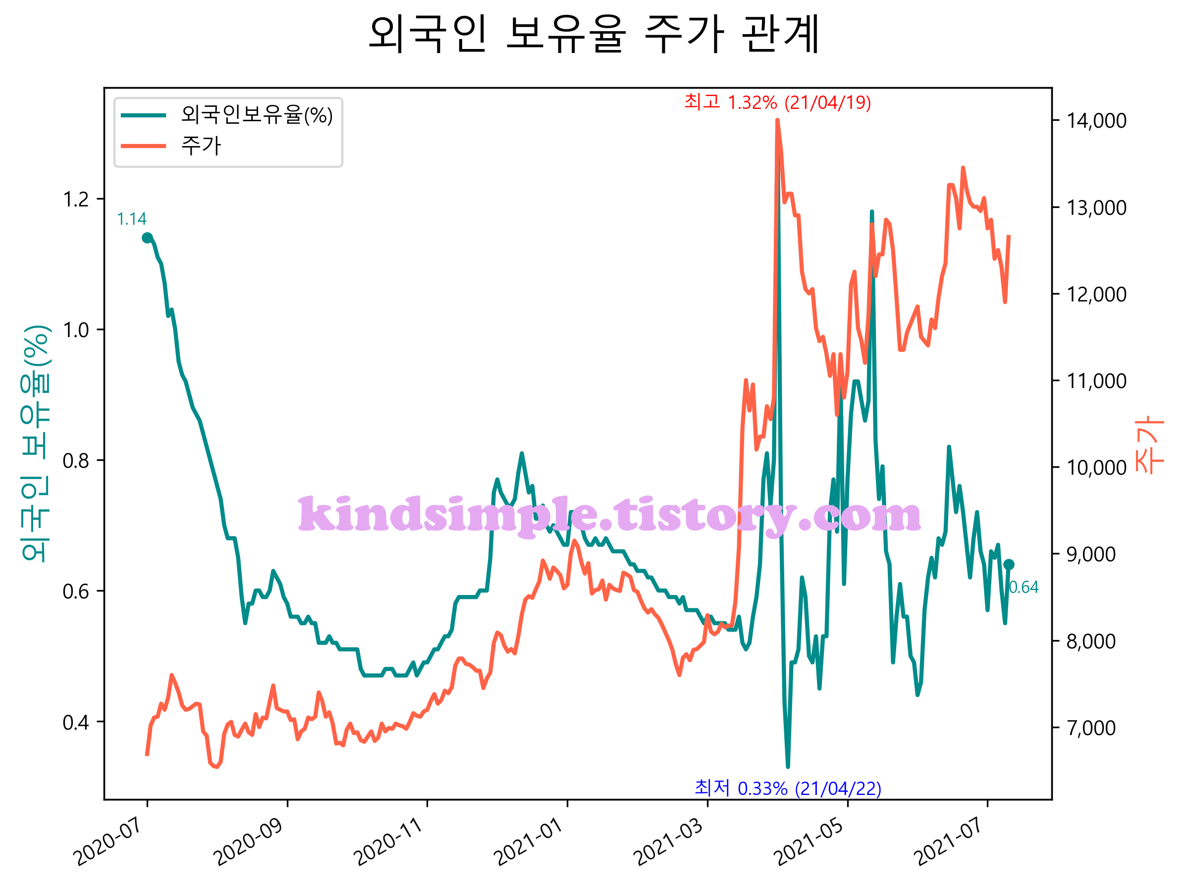 최근 1년간 외국인 보유율 및 주가와의 관계입니다.