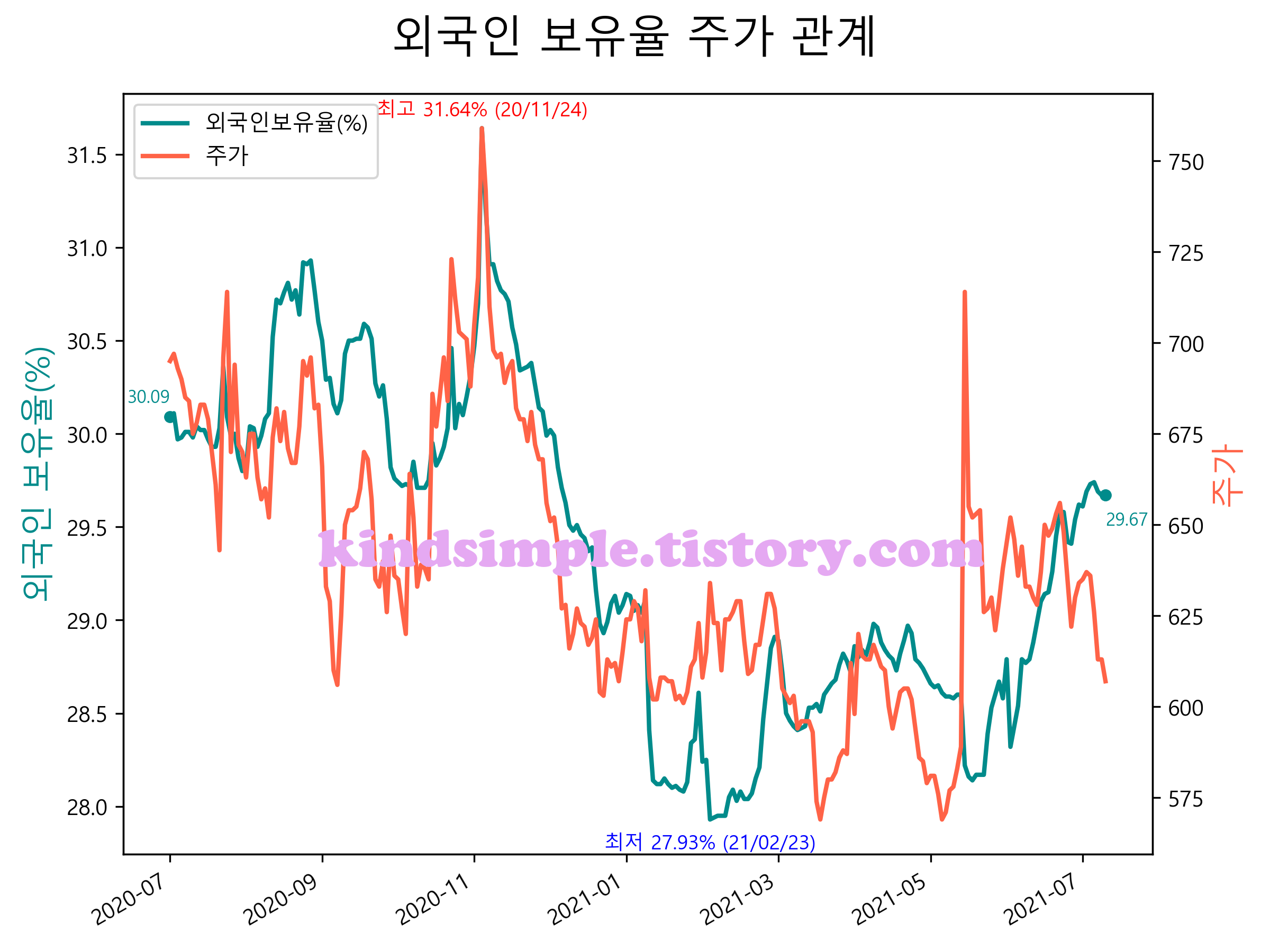 최근 1년간 외국인 보유율 및 주가와의 관계입니다.
