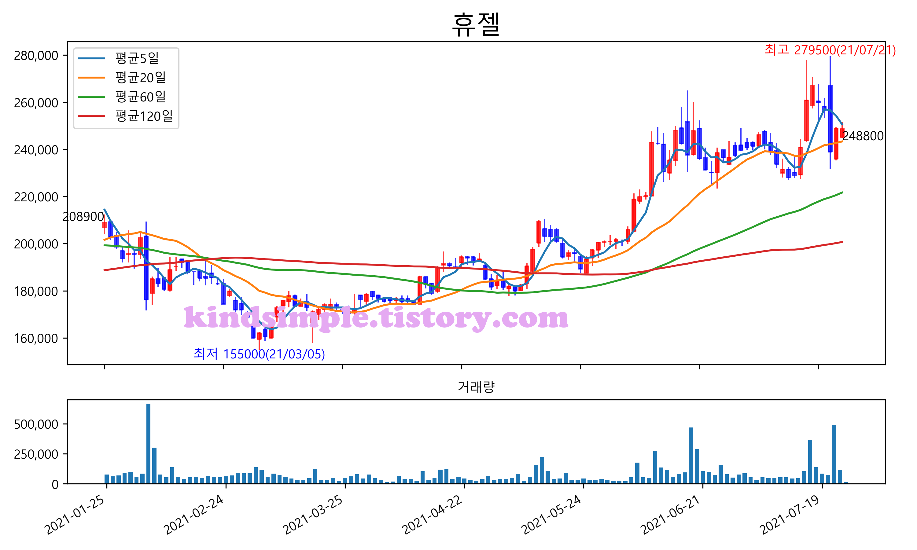 최근 6개월간 캔들차트 및 이동평균선입니다.