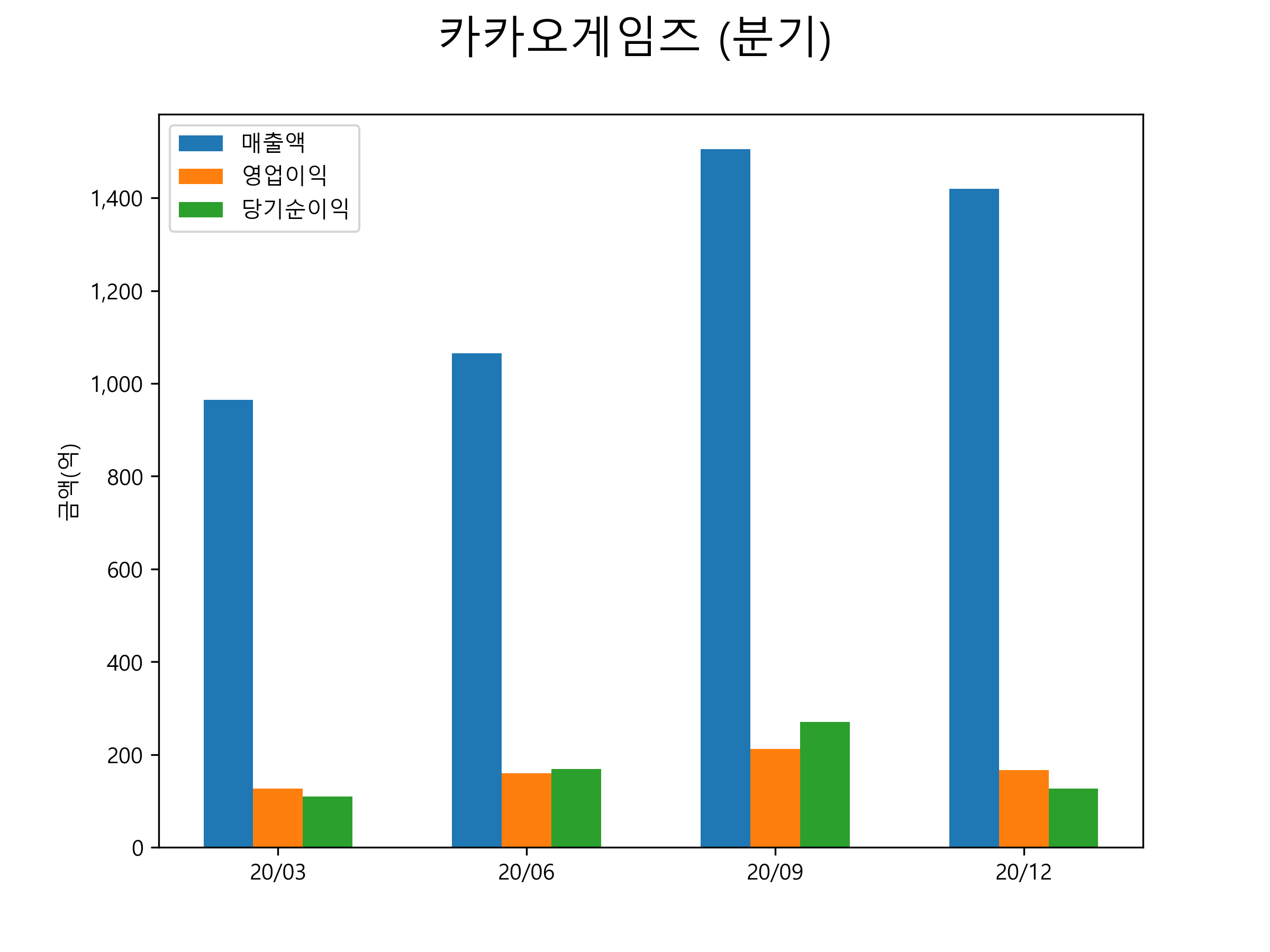 카카오게임즈의 2020년 4분기 매출은 1420억원, 영업이익 166억원, 당기순이익 127억원을 기록했습니다. 카카오게임즈의 분기별 매출 및 영업이익, 당기순이익 표입니다.