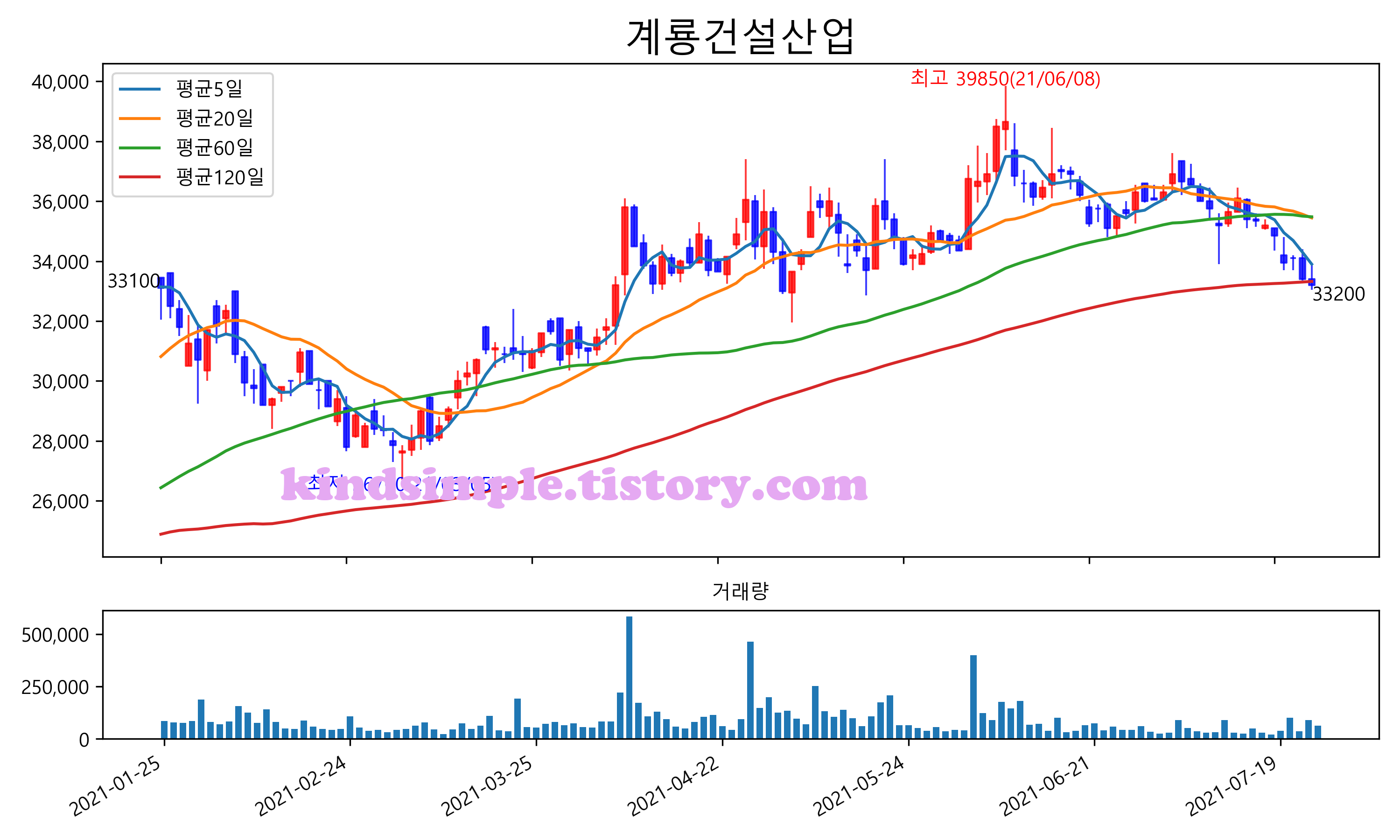 최근 6개월간 캔들차트 및 이동평균선입니다.