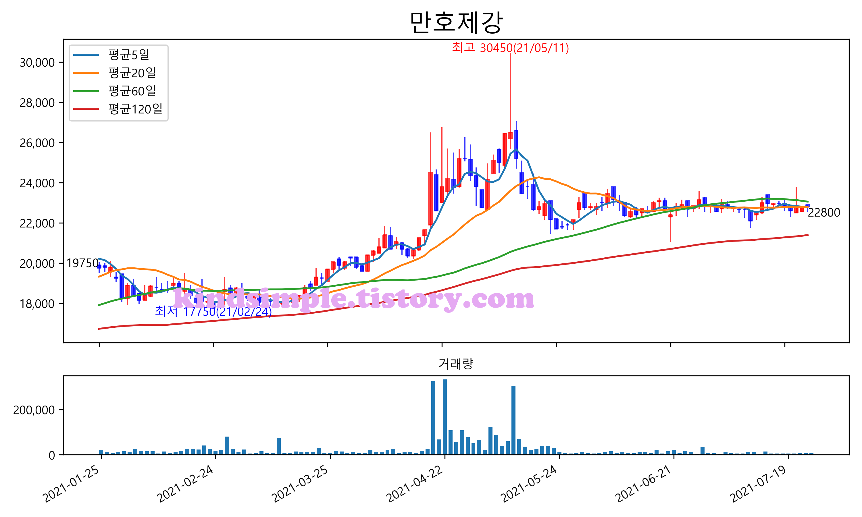 최근 6개월간 캔들차트 및 이동평균선입니다.