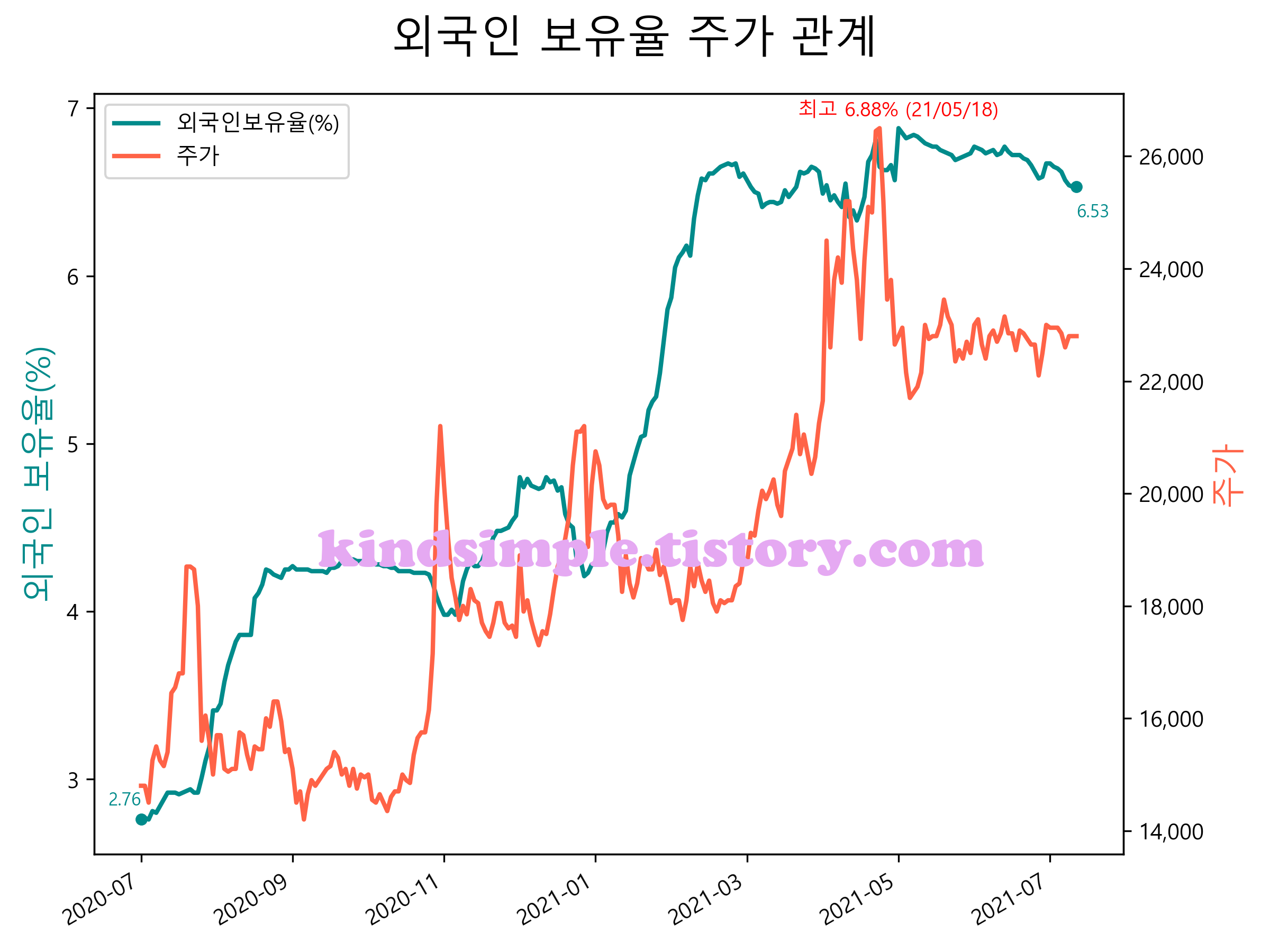 최근 1년간 외국인 보유율 및 주가와의 관계입니다.