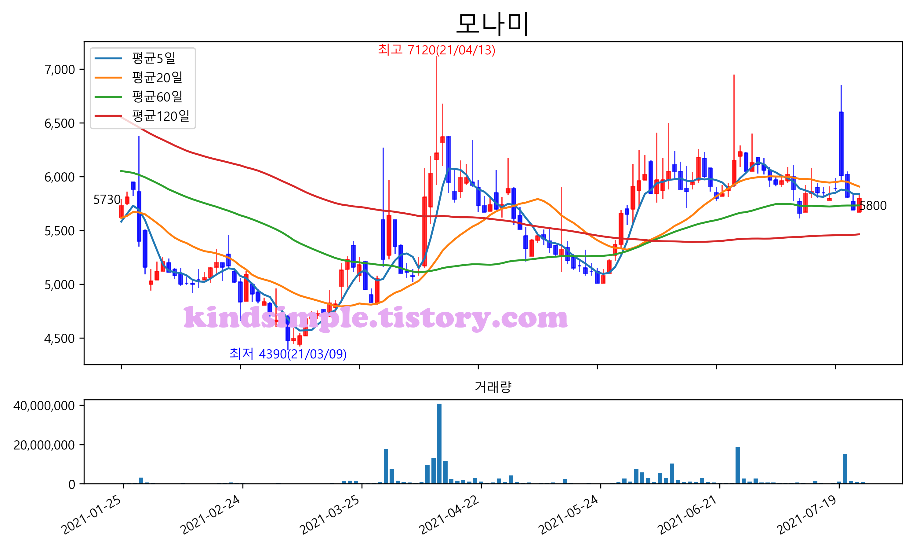최근 6개월간 캔들차트 및 이동평균선입니다.