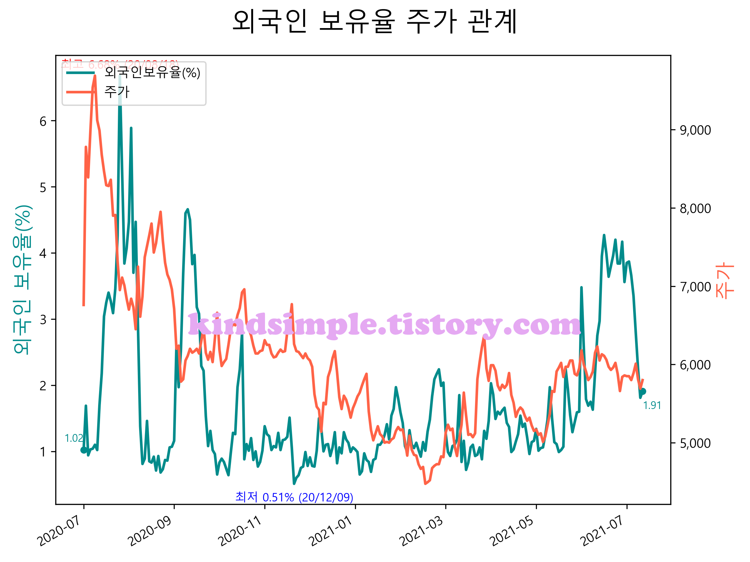 최근 1년간 외국인 보유율 및 주가와의 관계입니다.