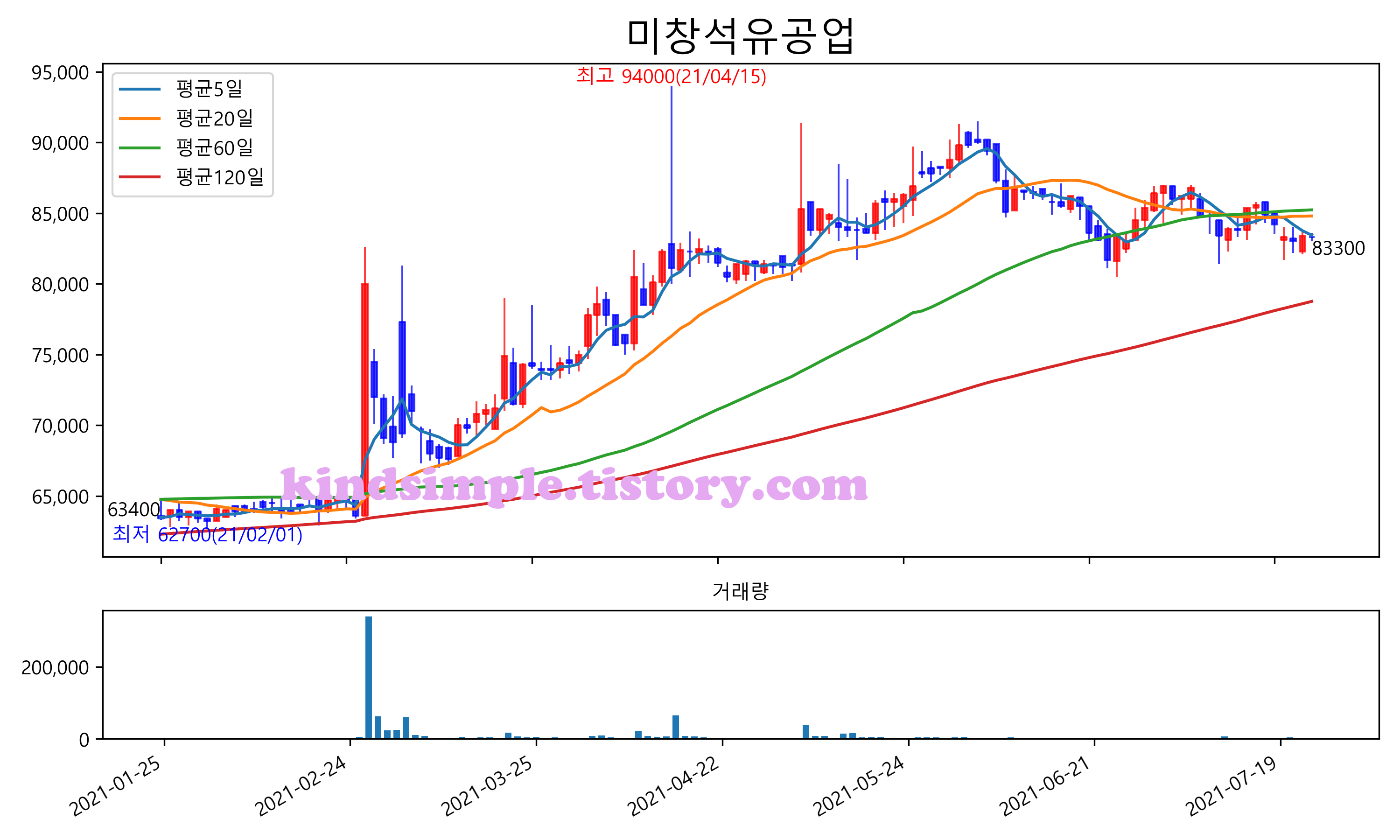 최근 6개월간 캔들차트 및 이동평균선입니다.