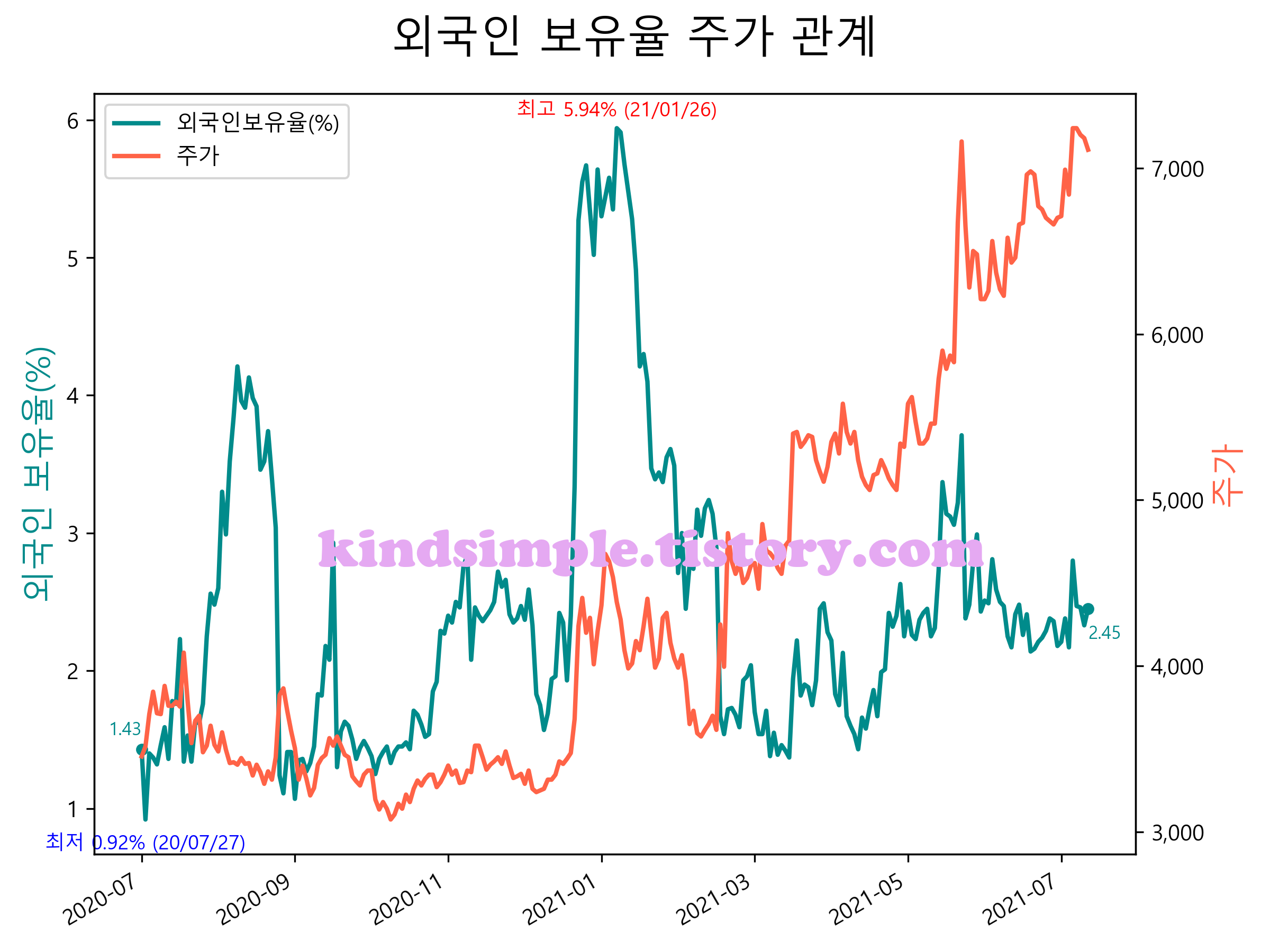 최근 1년간 외국인 보유율 및 주가와의 관계입니다.