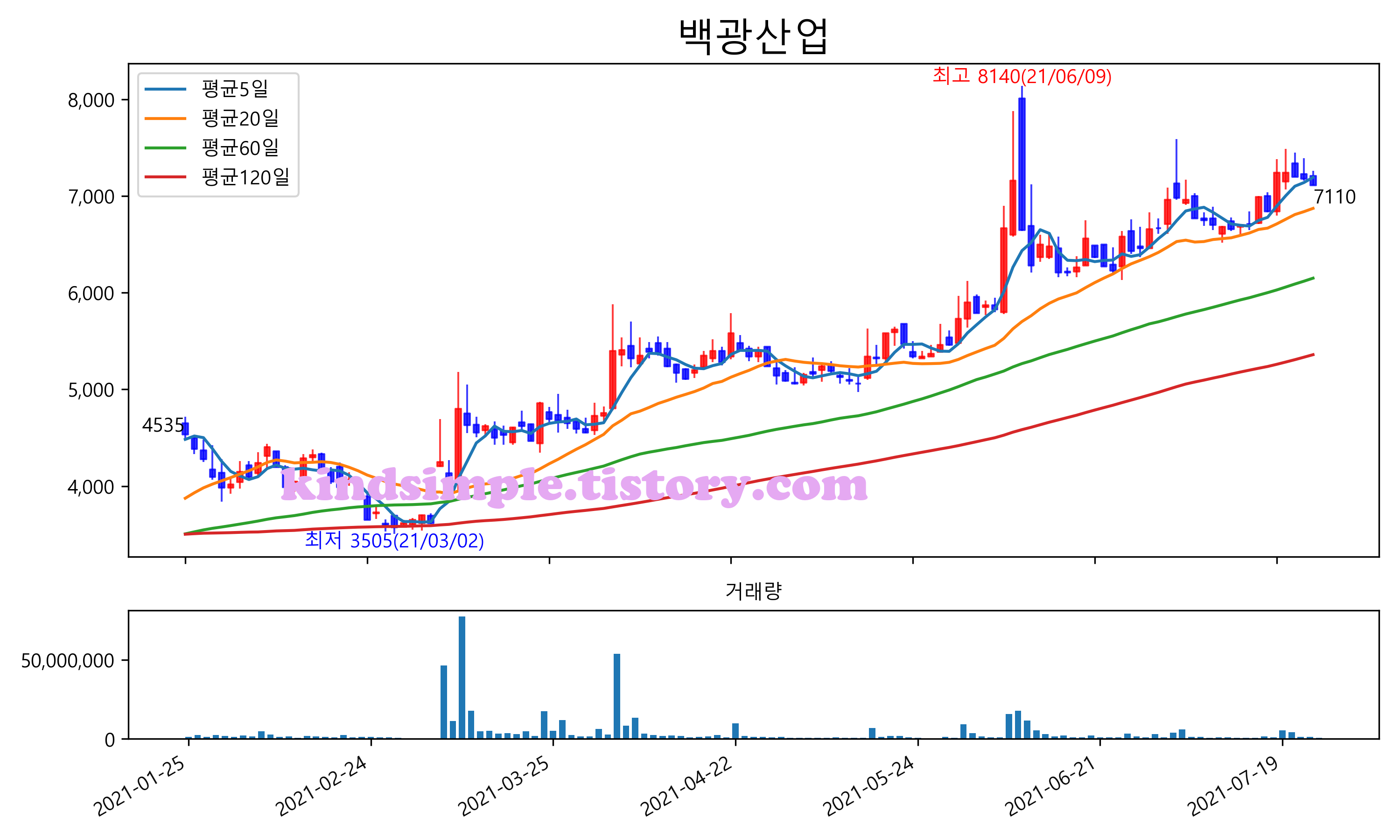 최근 6개월간 캔들차트 및 이동평균선입니다.